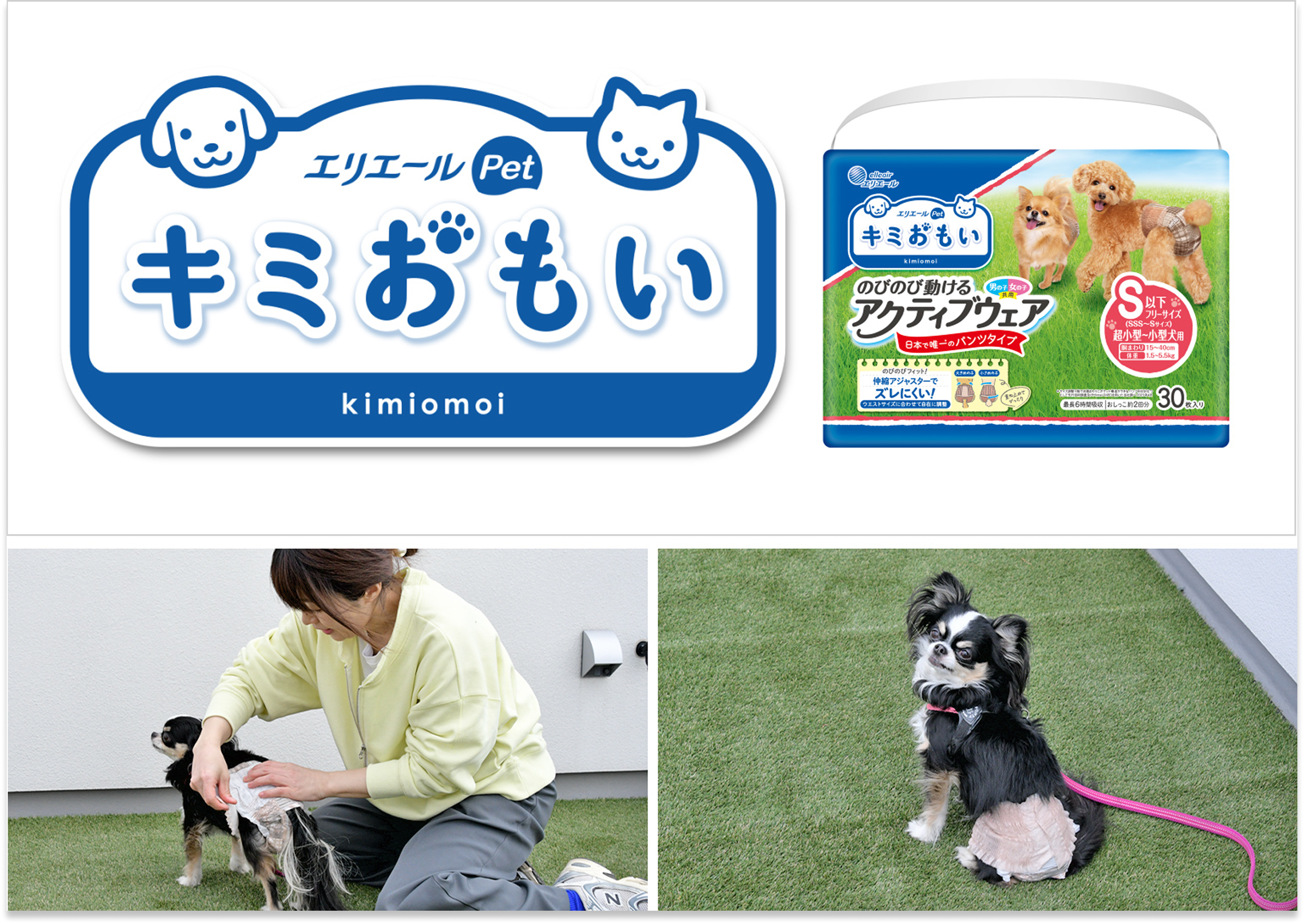 エリエールPetキミおもい『アクティブウェア』は、動きやすさと快適性を兼ね備えた愛犬用おむつ。やわらかな素材でフィットし、元気に走ってもズレにくい設計。吸収力もしっかりありながら、ごわつきにくく、長時間のお出かけも快適にサポートしてくれます。