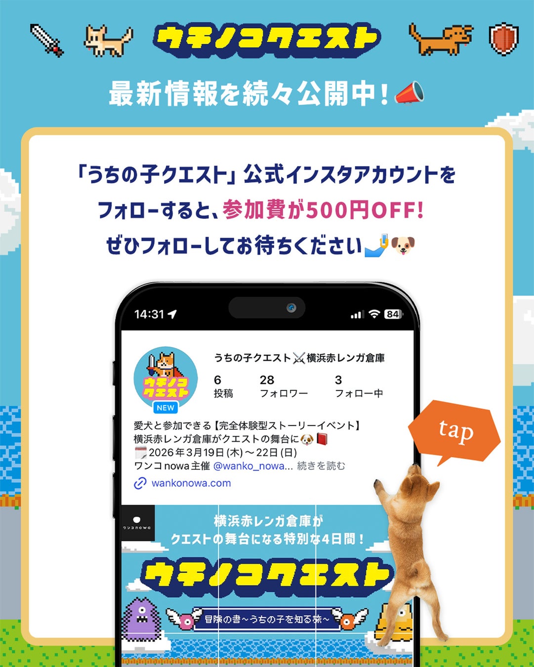 日本最大級の犬メディア「ワンコnowa」がプロデュースする新感覚ドッグイベント 『うちの子クエスト』 が、2026年3月19日(木)〜22日(日)の4日間、横浜赤レンガ倉庫にて開催されます。
