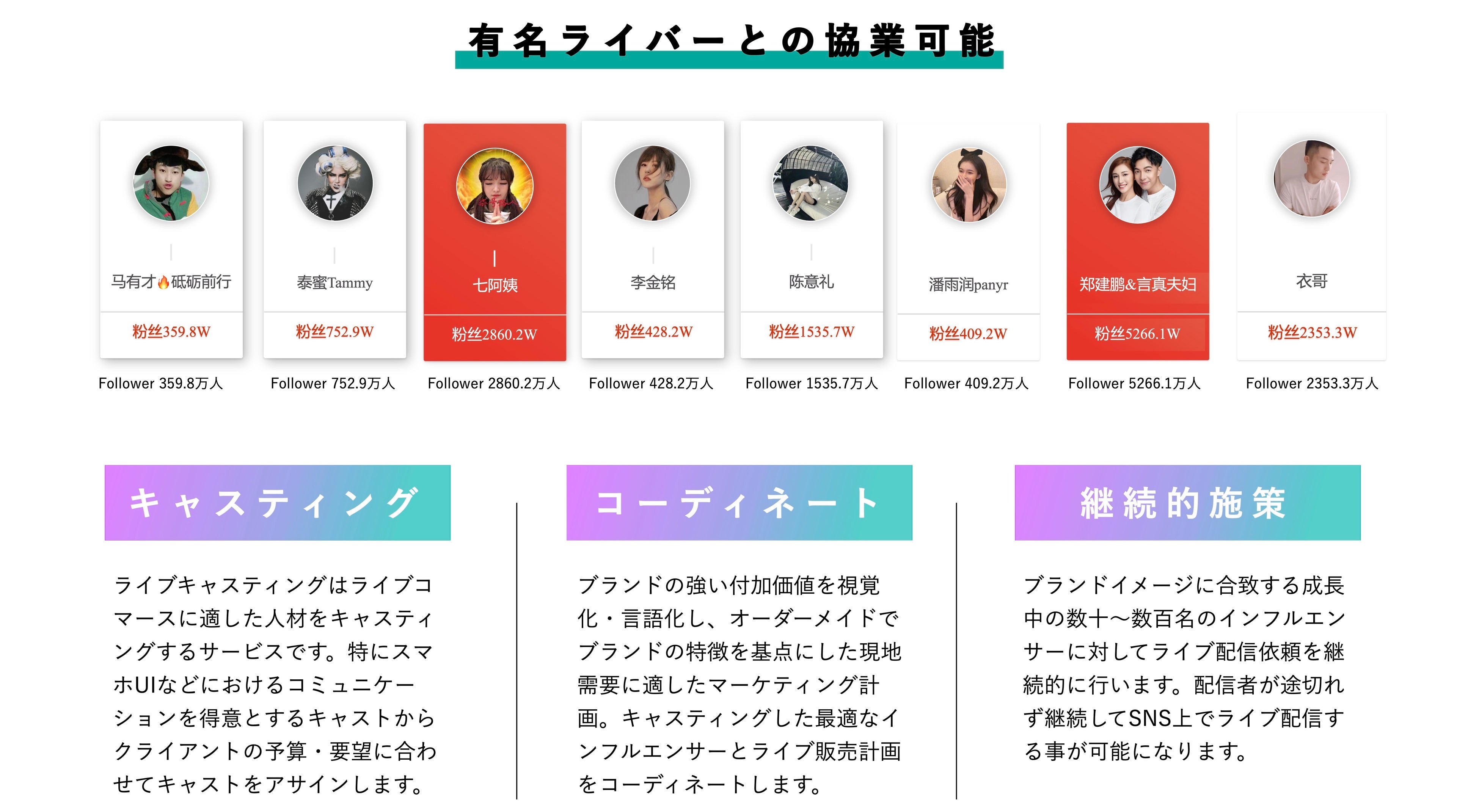 *中国でプラットフォーム上で販売できる状態にする、している必要が御座います。これらの準備を弊社で行う事も可能。1000人以上のインフルエンサーとMCN企業と提携により影響力のあるKOLをキャスティング