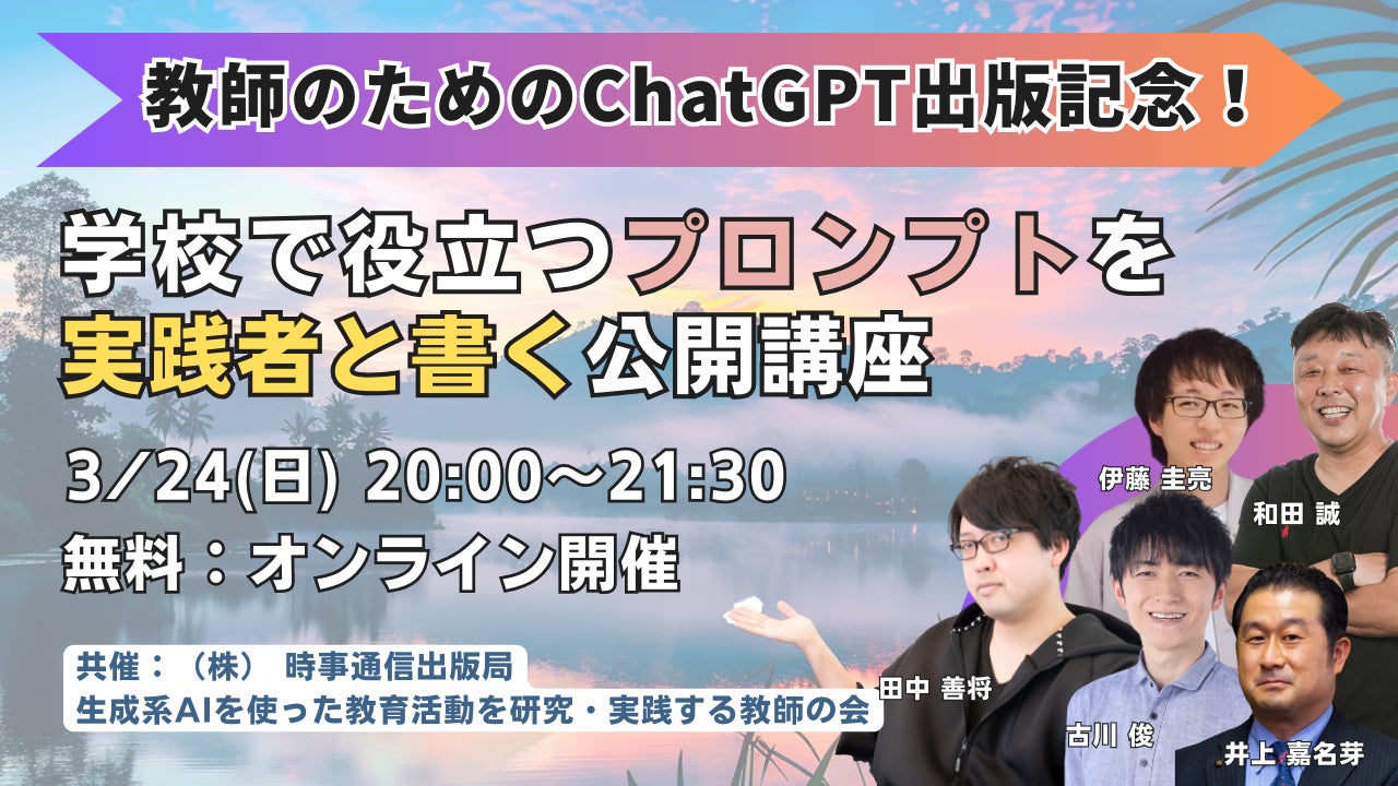 スクールエージェント株式会社(本社:東京都新宿区、代表取締役:田中 善将)は、弊社代表の田中善将が監修しました教師向けのChatGPT活用本「教師のためのChatGPT」の出版に際しまして、(株)時事通信出版局様と共催のオンラインセミナー、「 "学校で役立つプロンプト"を実践者と書く公開講座」を3/24(日)に開催することを決定しました。