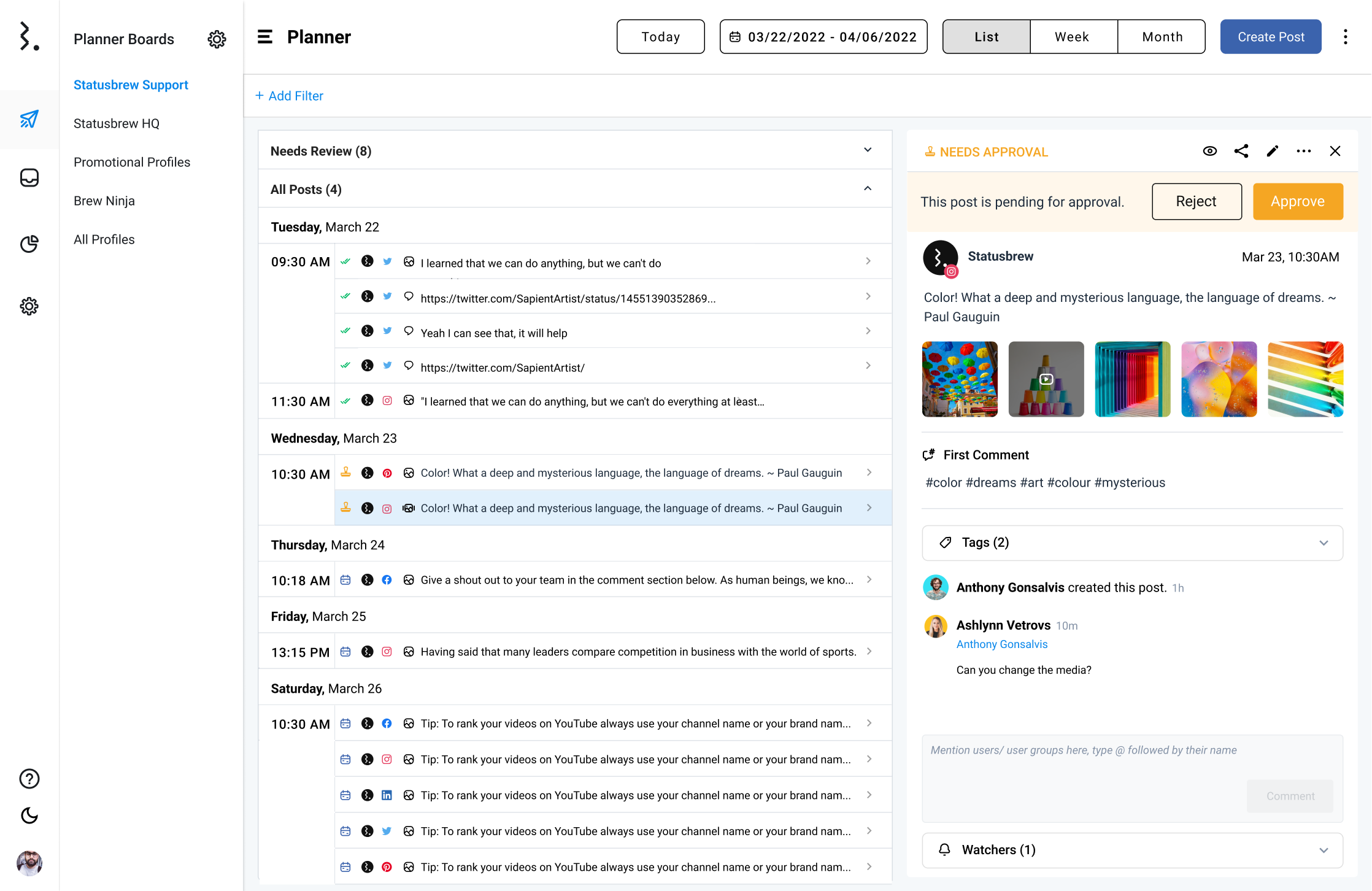 承認申請が通った投稿は自動的に予約キューへ移動し、ソーシャルメディアのエディトリアルカレンダーにてタスク管理します。