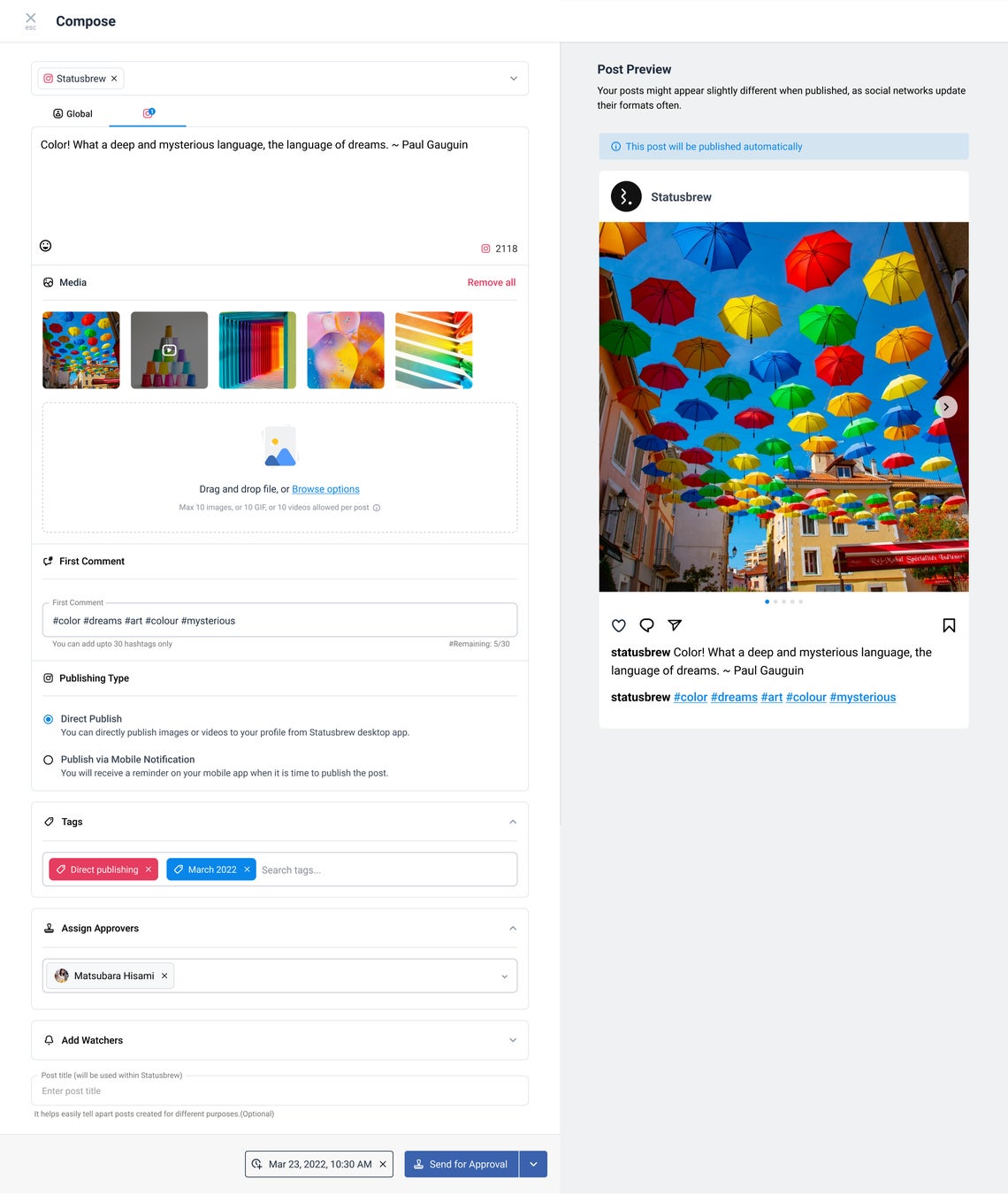 - Statusbrewの投稿エディター「コンポーズ」で承認プロセスも同時機能