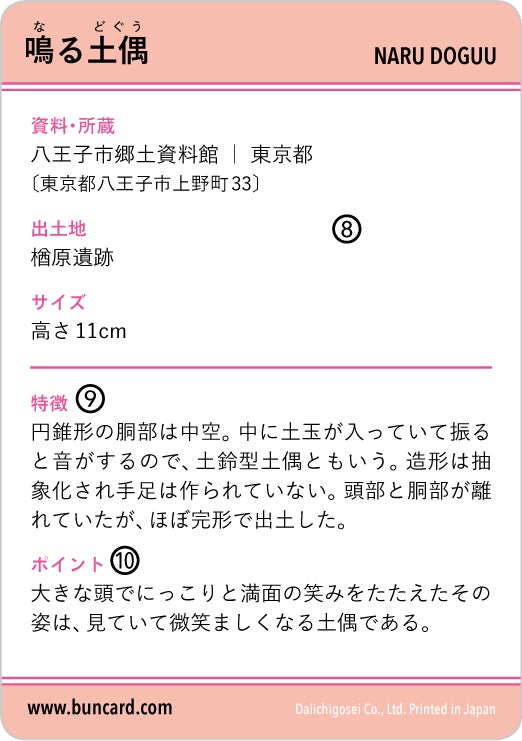 BUNCARDは特定の文化財の名称・写真・具体的な解説・ポイント・展示施設情報などをポケットサイズに凝縮した全国統一規格のコレクションカードです。土器などの有形文化財や祭りなどの無形文化財、生き物などの天然記念物、特定の地域の歴史的景観など様々です。