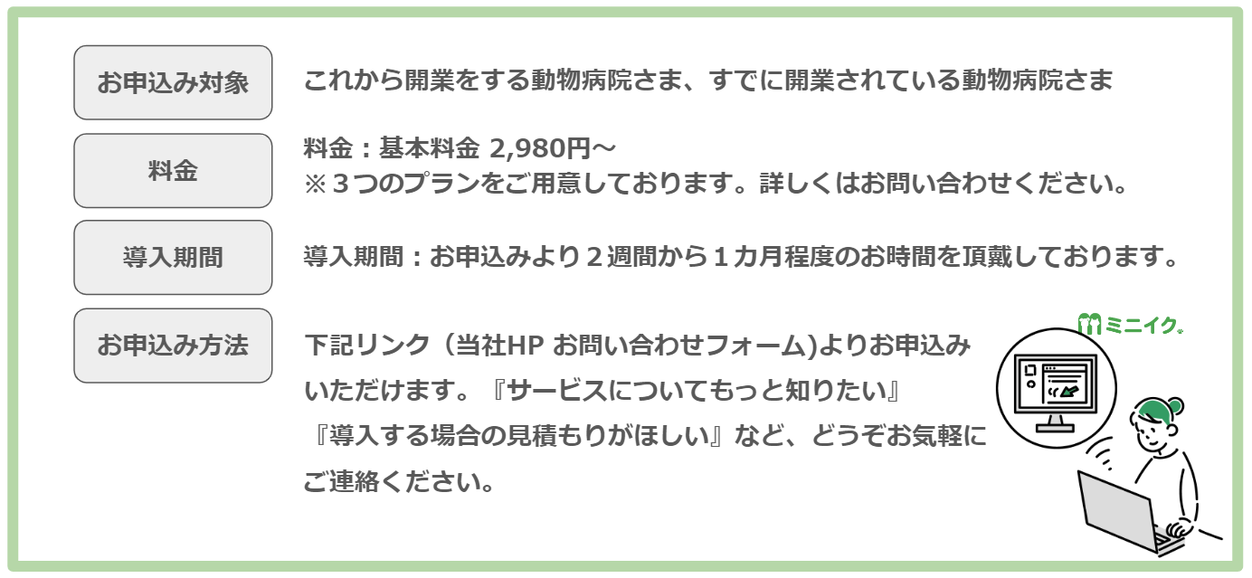 事業内容:動物病院向けのクラウド型一元管理サービス「ミニイク」の運営、どうぶつ事業者のWEBサイト制作及び運営