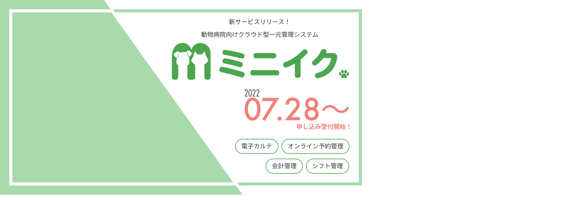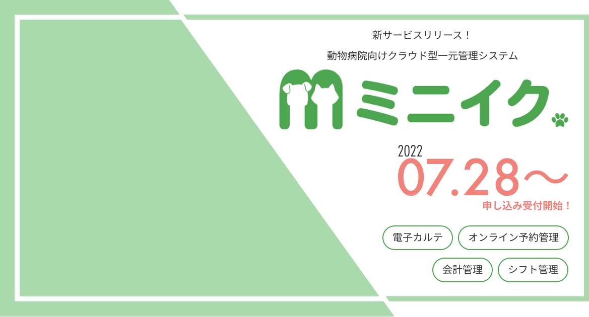 動物病院向けクラウド型一元管理システム「ミニイク」を正式リリース。2022年7月28日(木)から動物病院の利用申込みを受付開始!!