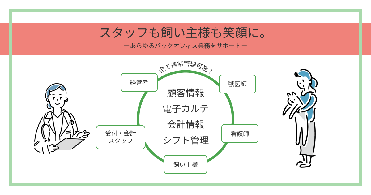 受付~会計までの事務作業、診察や入院・薬剤処方、スタッフの勤怠管理や売り上げ管理など、運営にかかわる広い範囲をカバー。既存の電子カルテのような獣医師だけが使いやすいものや、受付の方が保険申請しやすいだけのサービスとは異なり、院長・獣医師・動物看護師・受付スタッフ・飼い主の5者全員が楽になるような機能を、使いやすさにこだわった導線で配置しています。