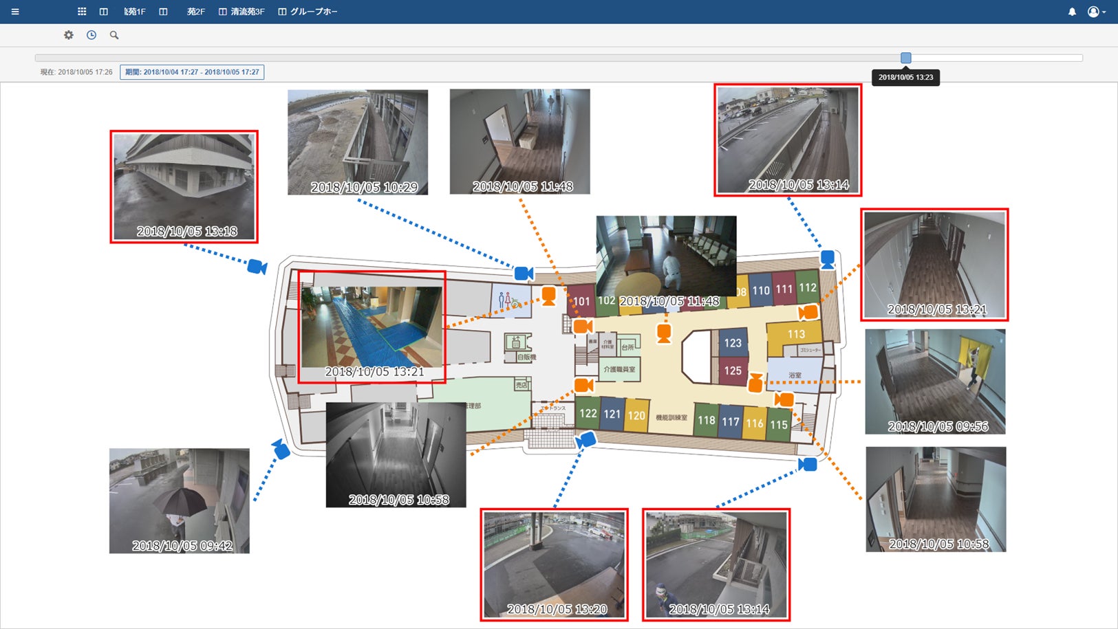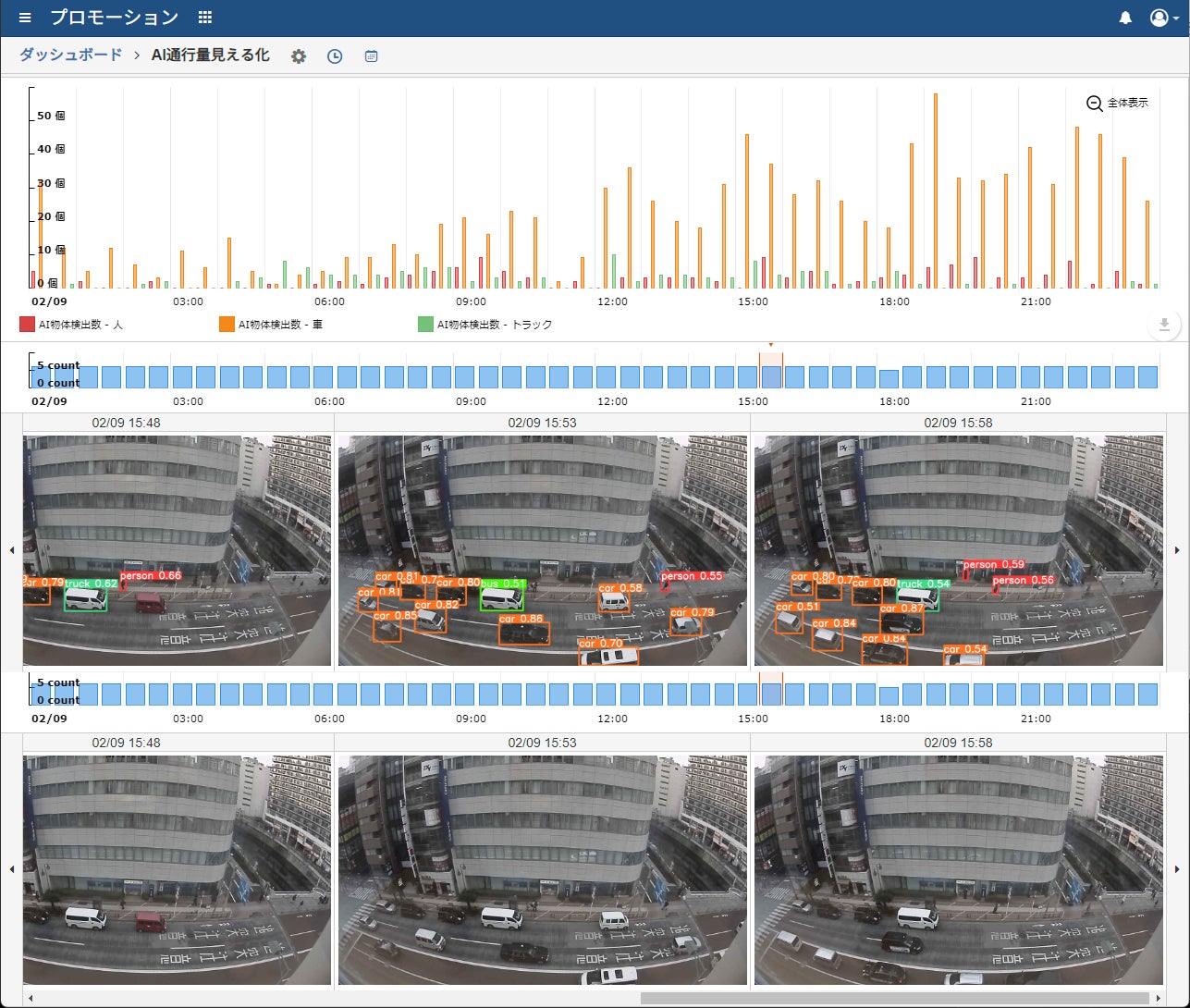 記録や監視といった業務への適用や画像解析や物体検知AI等の利用には「画像による保存と閲覧」が欠かせません。提供するソラカメAPIからの画像取得機能や取り込んだ画像の管理機能が役立ちます。カメラ画像の見える化には、自分で作れる「ノーコードUI・画面機能(マルチカメラダッシュボード/カメラ画像表示)」を持つ「RealBoard」をご利用いただけます。
