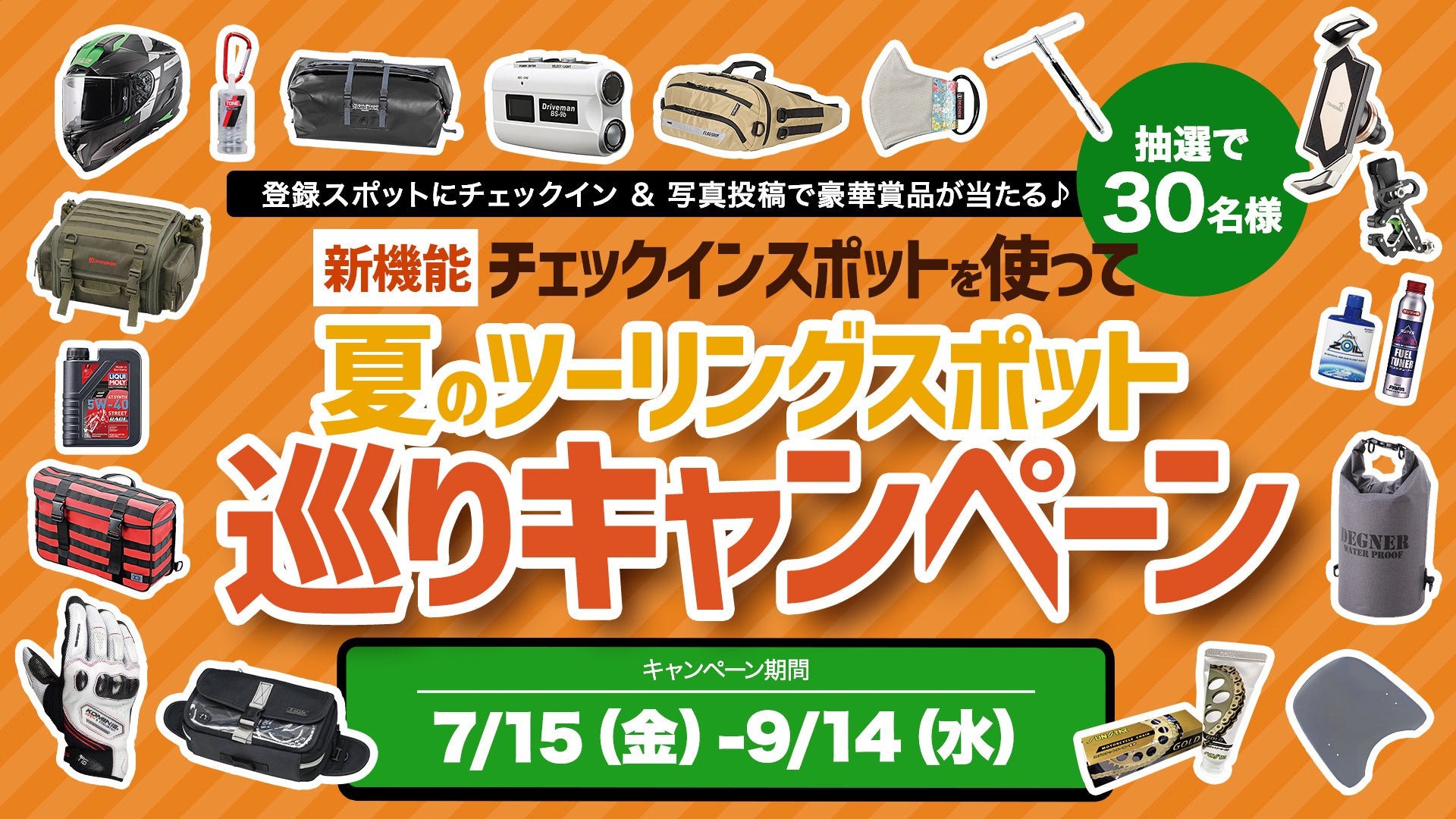 この夏、ツーリングの目的地としてチェックインスポットを巡りながらツーリングを楽しみましょう♪そして「チェックイン」&「バイクと共に写真投稿」して豪華賞品もゲットしちゃいましょう!