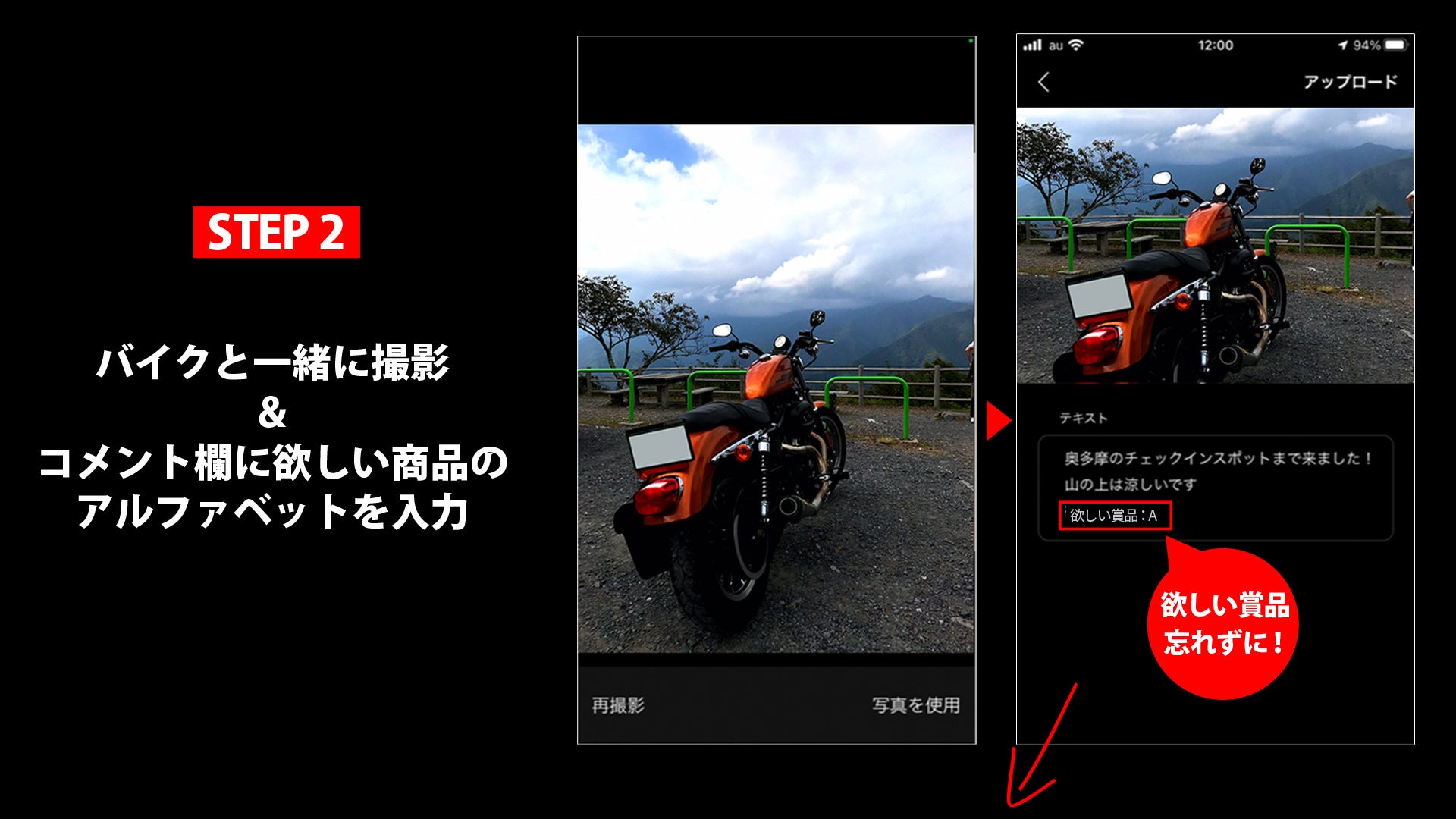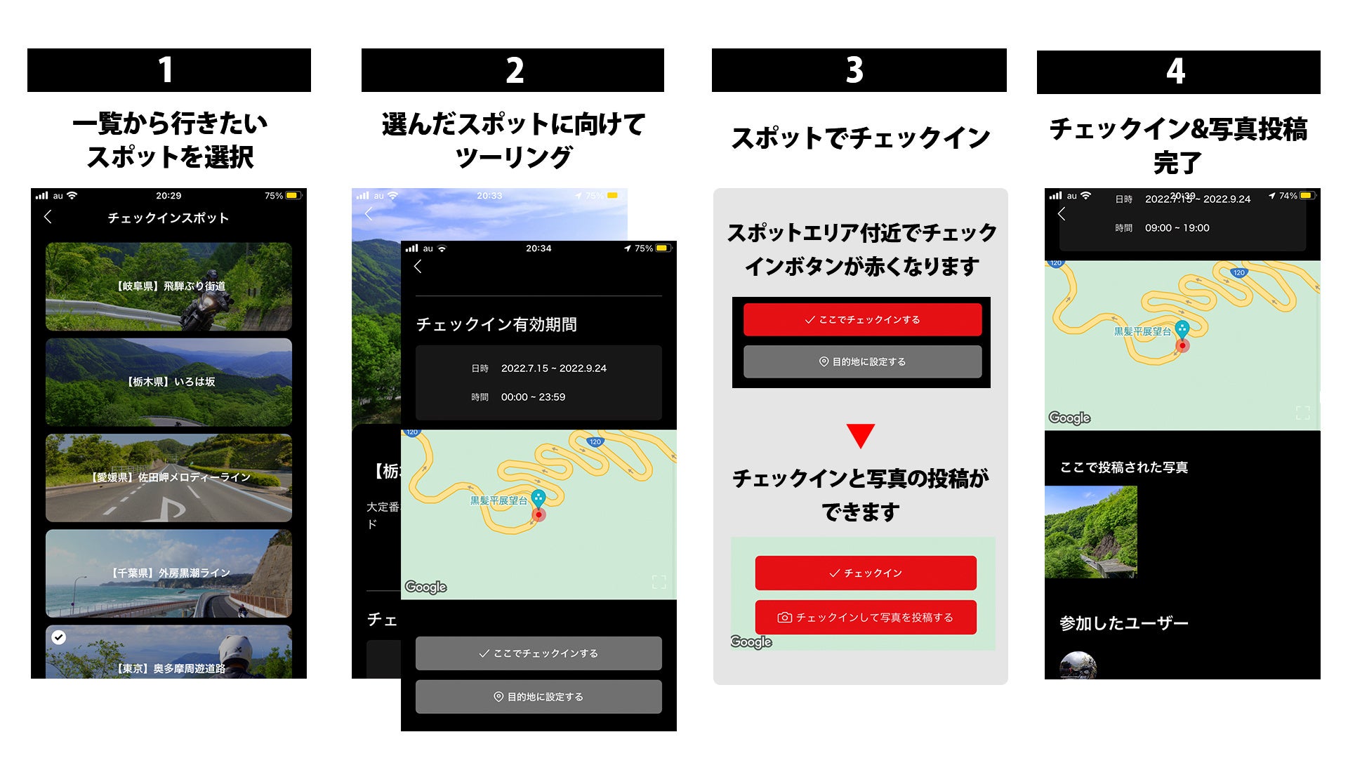 期間中にツーリングアプリ「RidersSquare」に登録されているチェックインスポットに「チェックイン」し、「バイクと共に写真を投稿」するのみ。