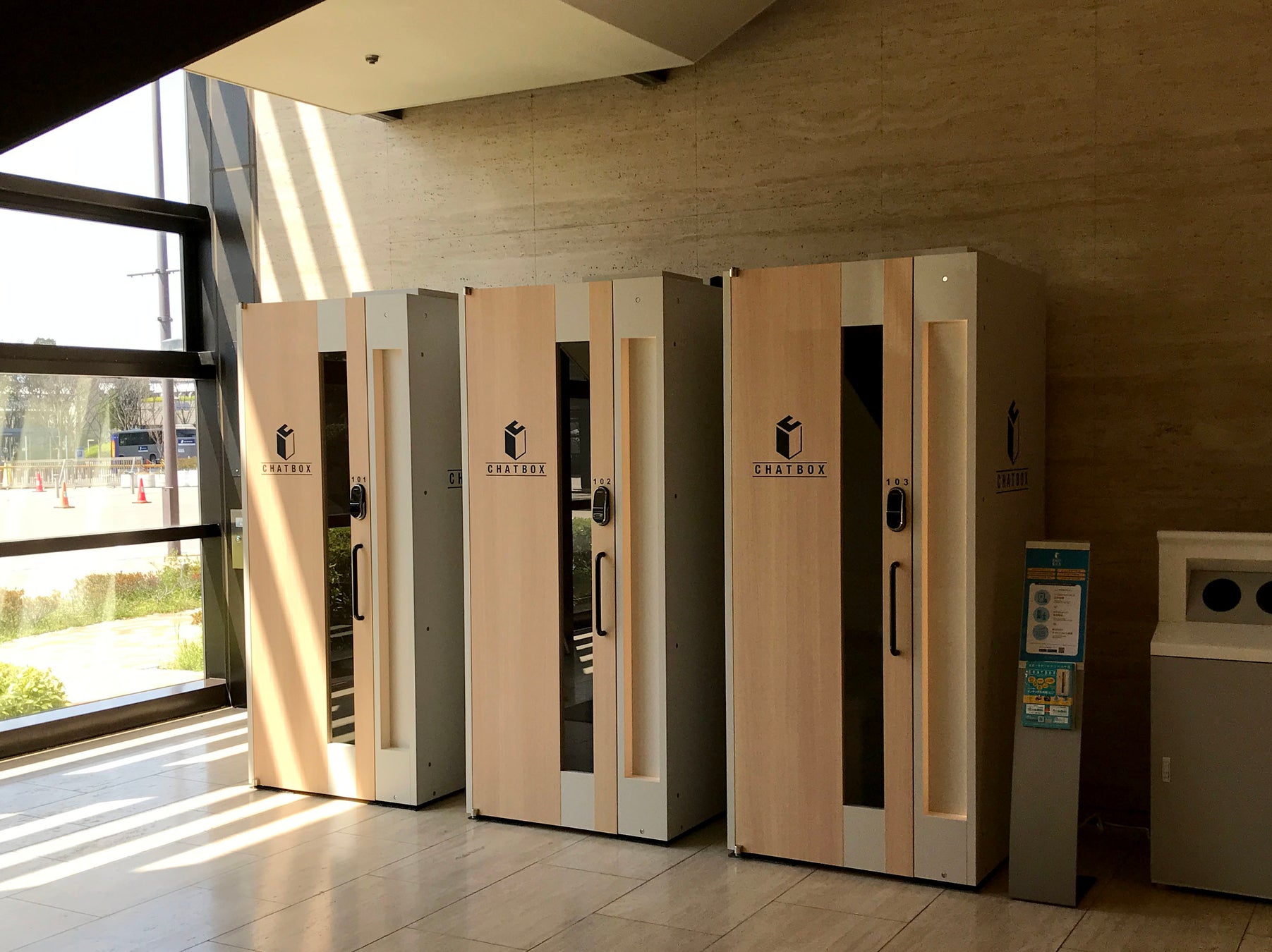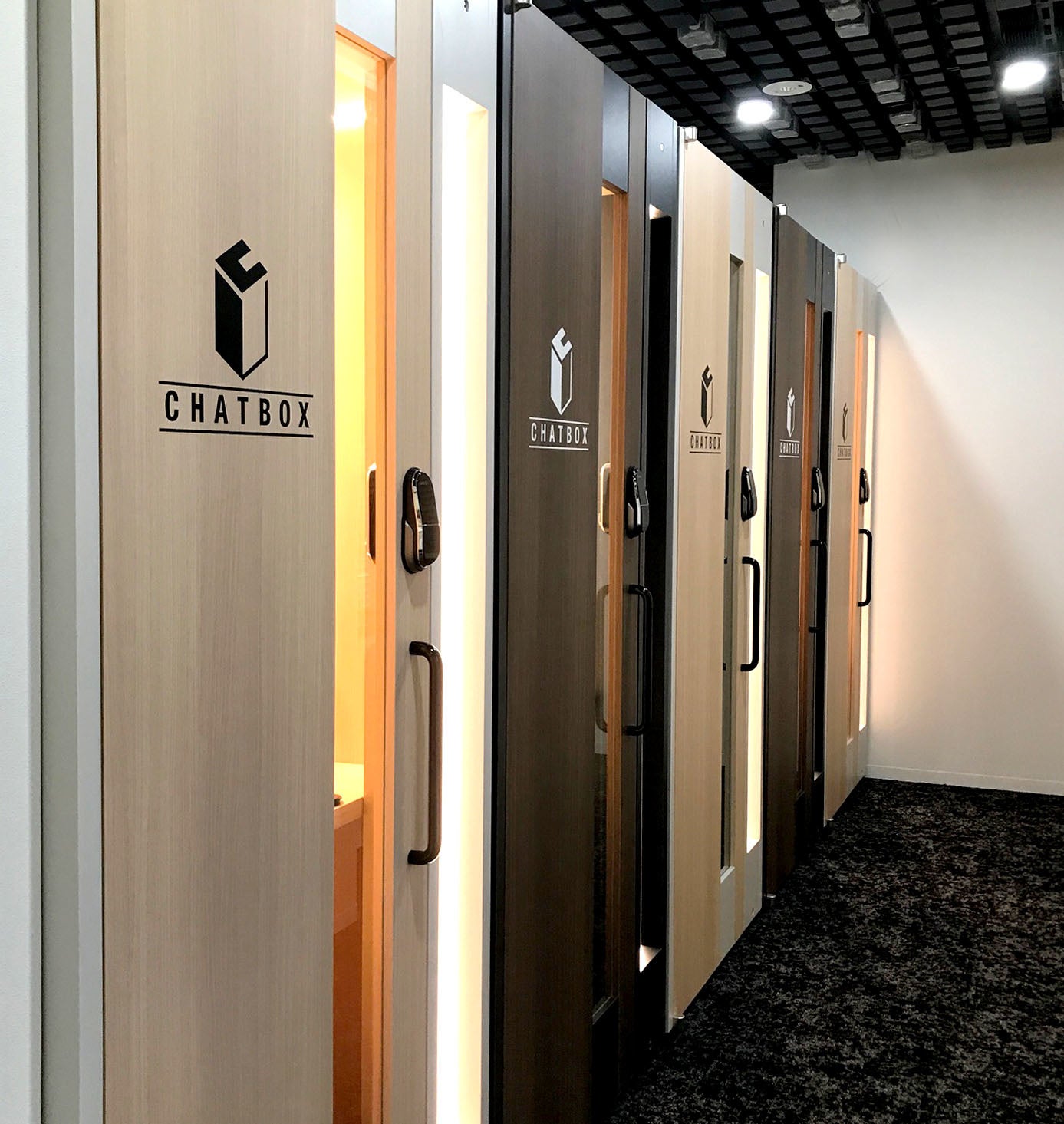CHATBOX本体は、弊社グループ「ディシディア・ワイム株式会社」のデザインチームによるスタイリッシュなデザイン。ブース内には、ご利用者様に快適にご利用頂けるよう様々な機能が備え付けられています。