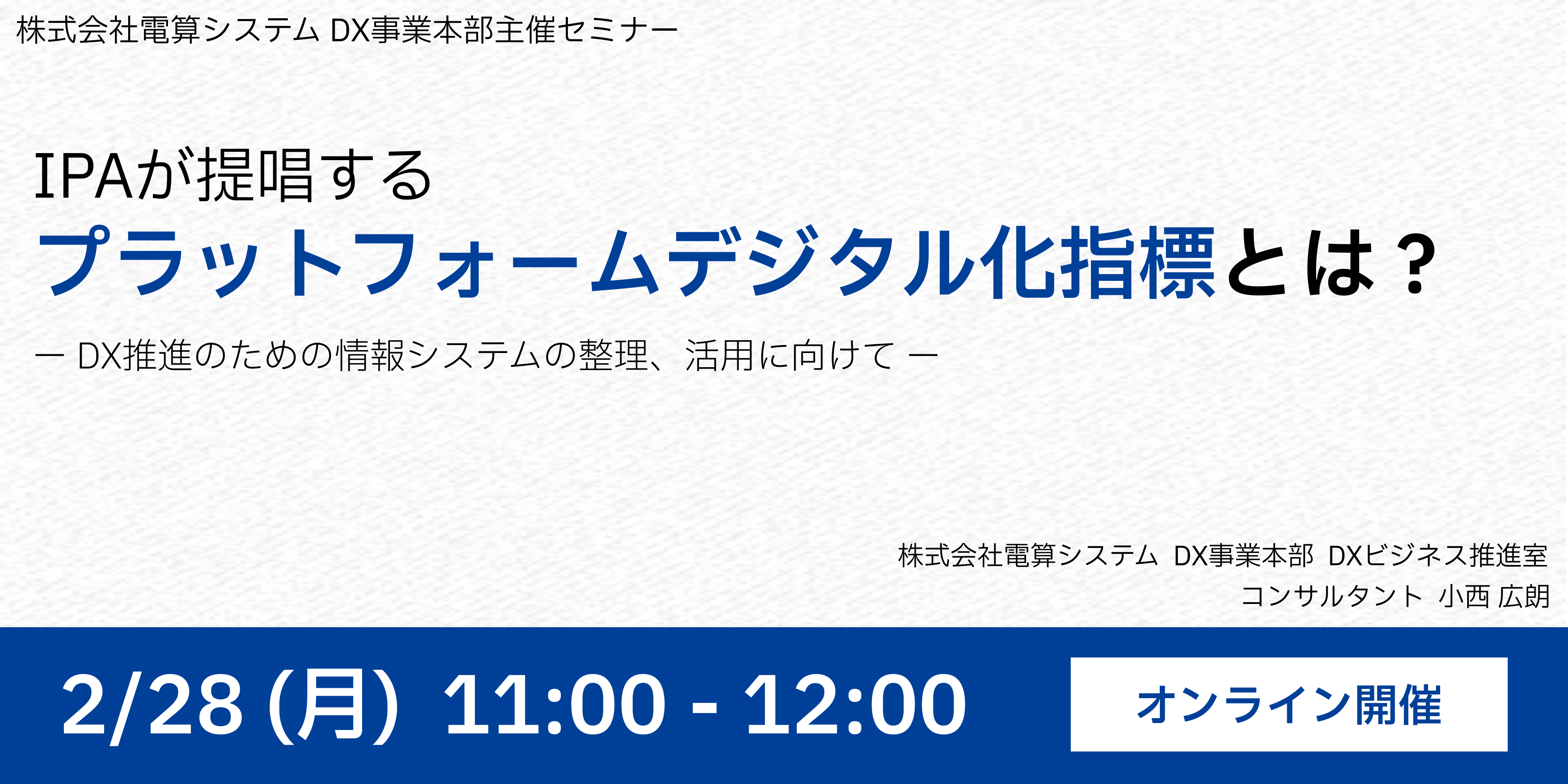 株式会社電算システム(本社:岐阜県岐阜市、代表取締役社長執行役員:高橋 譲太 以下「電算システム」)は、DXを推進するユーザー企業が、独立行政法人 情報処理推進機構(以下「IPA」)監修の『プラットフォームデジタル化指標』を活用するための解説セミナーを2022/2/28(月)に開催いたします。