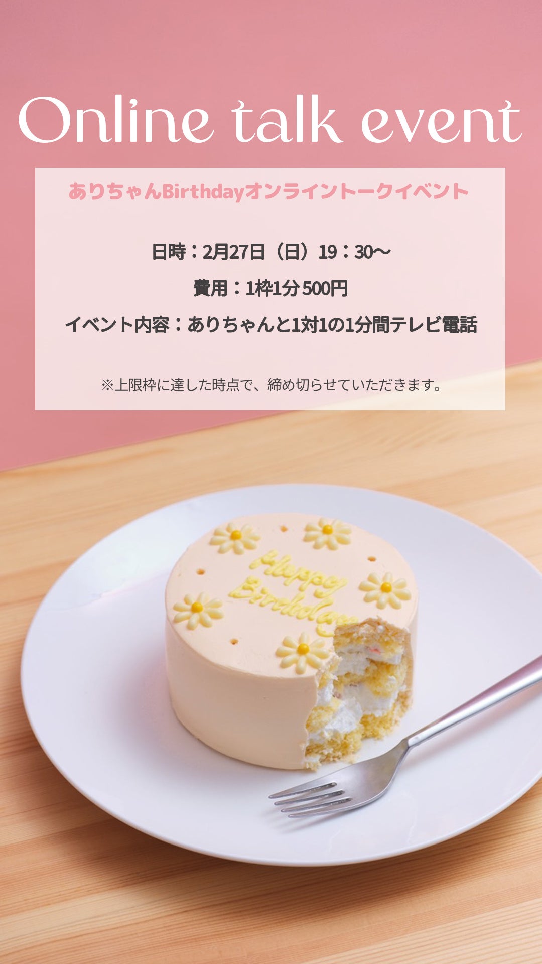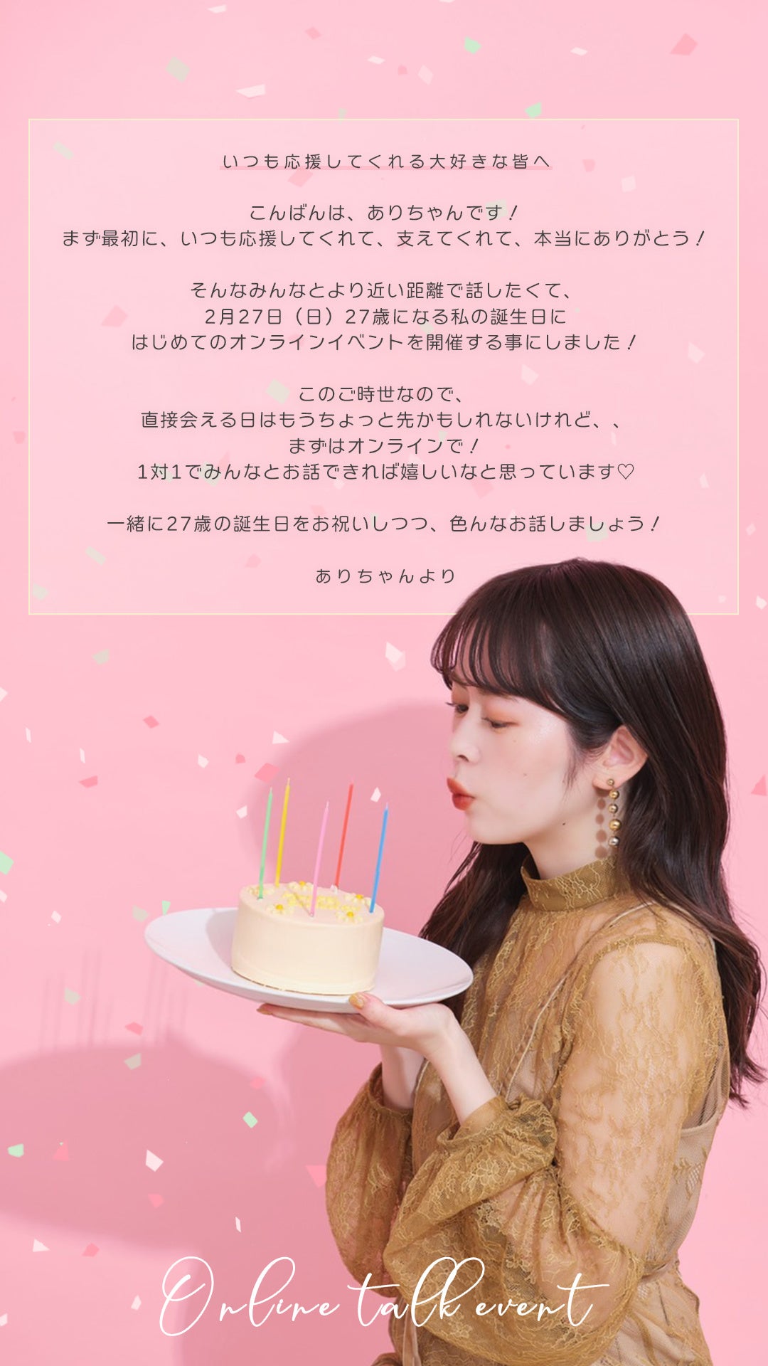 みなさん、こんにちは!毎月の支出の半分をコスメに充てる女こと、ありちゃんです!まず最初に、いつも応援してくれて、支えてくれて、本当にありがとう!そんなみんなとより近い距離で話したくて、2月27日(日)27歳になる私の誕生日にはじめてのオンラインイベントを開催する事にしました!このご時世なので、直接会える日はもうちょっと先かもしれないけれど、まずはオンラインで!1対1でみんなとお話できれば嬉しいなと思っています。一緒に27歳の誕生日をお祝いしつつ、色んなお話しましょう!