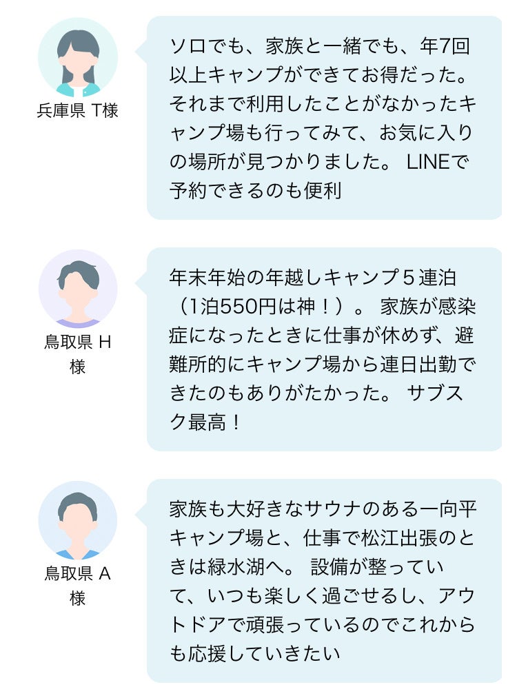 TOTTORI-CAMPPARK=鳥取県でキャンプ事業を展開する株式会社スマイルキューブ(本社/鳥取県南部町)は、2024年度版「年間パスポート」を5月31日より発売いたします。鳥取県内の複数キャンプ場を定額でいつでも何度でも利用できる会員限定サービスとして2021年に開始、毎年ご好評をいただいてきました。今回、県東部の大型施設「わかさ氷ノ山キャンパーズヴィレッジ」が利用対象に加わることで、鳥取県内外からのさらなる利用拡大をめざします。