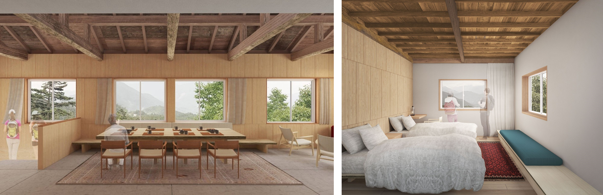 小屋内が暗くなりがちな山小屋ですが、改装にあたり、古い小屋の良さを生かしながらアップデートしました。冷泉小屋では天井を取り除き建築当初の梁を表に出すことで空間を確保しました。