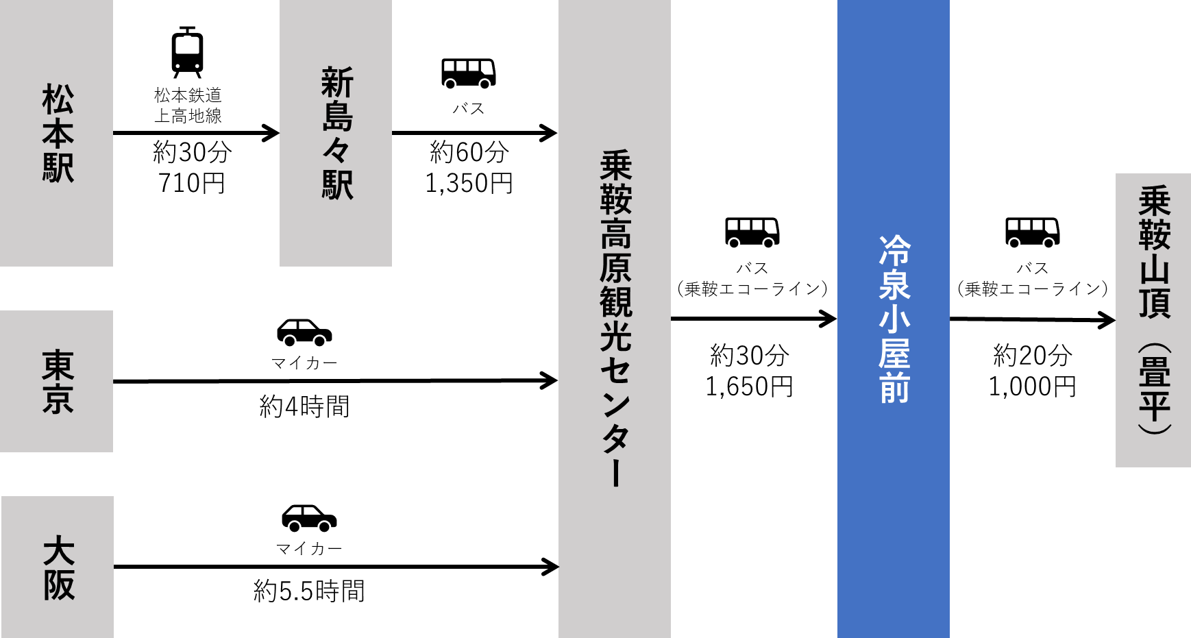 アルピコバスやタクシーで麓から冷泉小屋まで直行。乗鞍観光センターからバスで約30分。小屋からの眺望をお楽しみください。