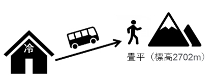 冷泉小屋から畳平までバスで直行(約20分)。畳平から約90分のハイキングで頂上に到達できます。