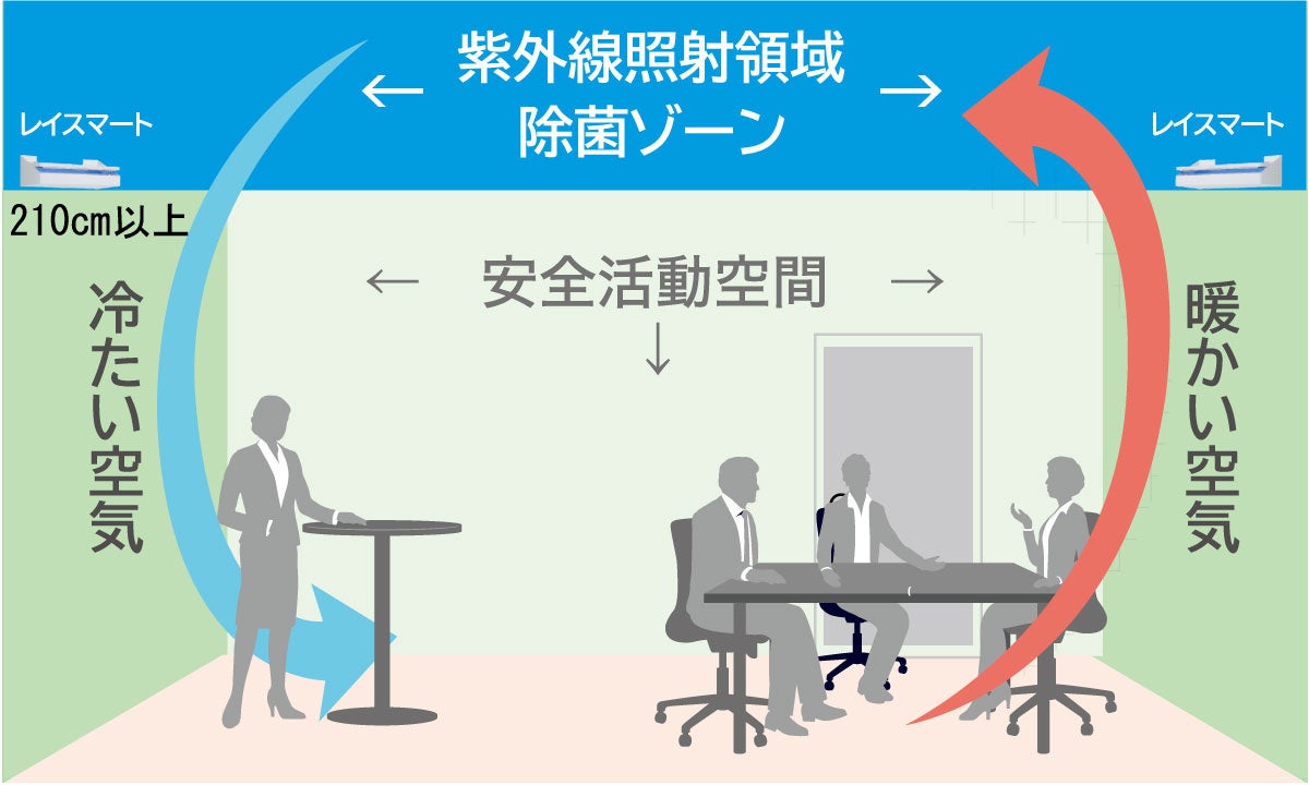 紫外線照射装置「レイスマート」は、室内上部の壁面取付型で紫外線を直線的に照射し、室内上部に漂うウイルス・浮遊菌やエアロゾルなどに対し作用します。