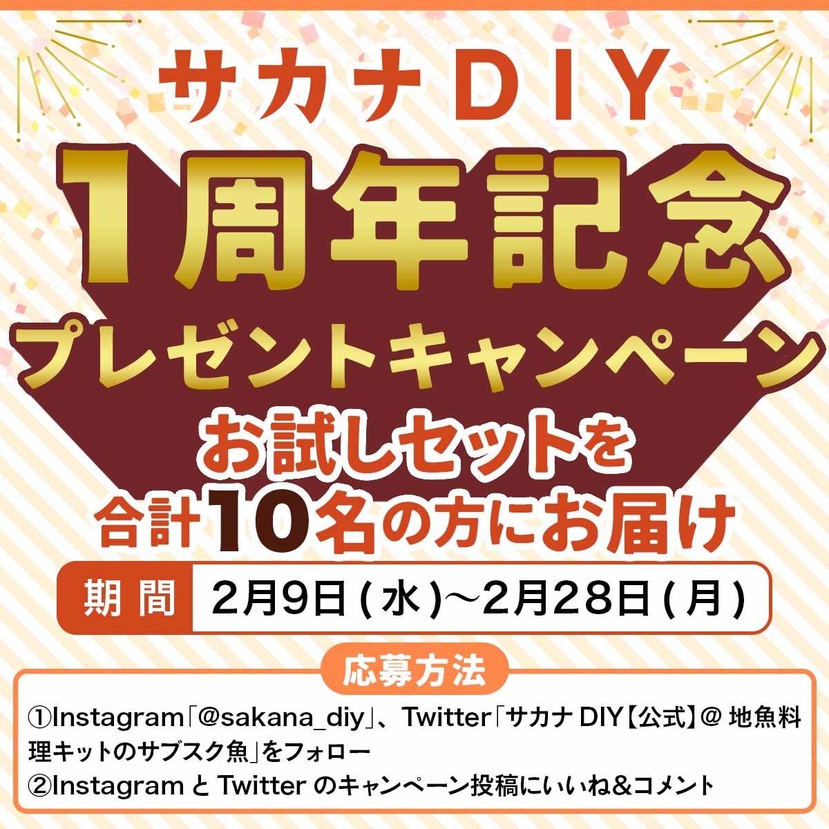 サカナDIYのInstagramとTwitterにフォロー&コメントをいただいた方の中から抽選で10名の方に「サカナDIY」お試しセットをお送りさせていただきます。