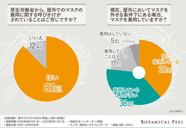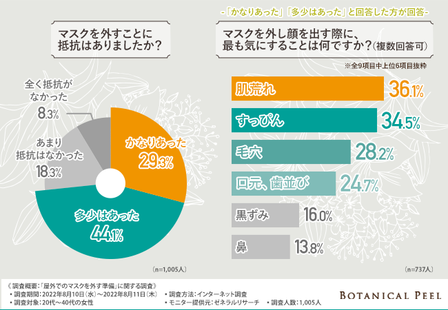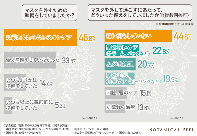 そこで、『BOTANICAL PEEL』(https://www.botanical-peel.com/)を販売する株式会社CREDEAは、20代~40代の女性を対象に、「屋外でのマスクを外す準備」に関する調査を実施しました。