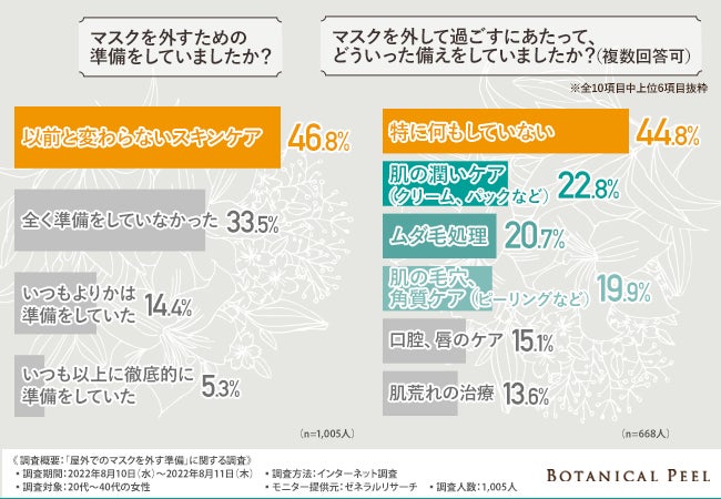 そこで、「マスクを外すための準備をしていましたか?」と質問したところ、『以前と変わらないスキンケア(46.8%)』と回答した方が最も多く、次いで『全く準備をしていなかった(33.5%)』『いつもよりかは準備をしていた(14.4%)』『いつも以上に徹底的に準備をしていた(5.3%)』と続きました。