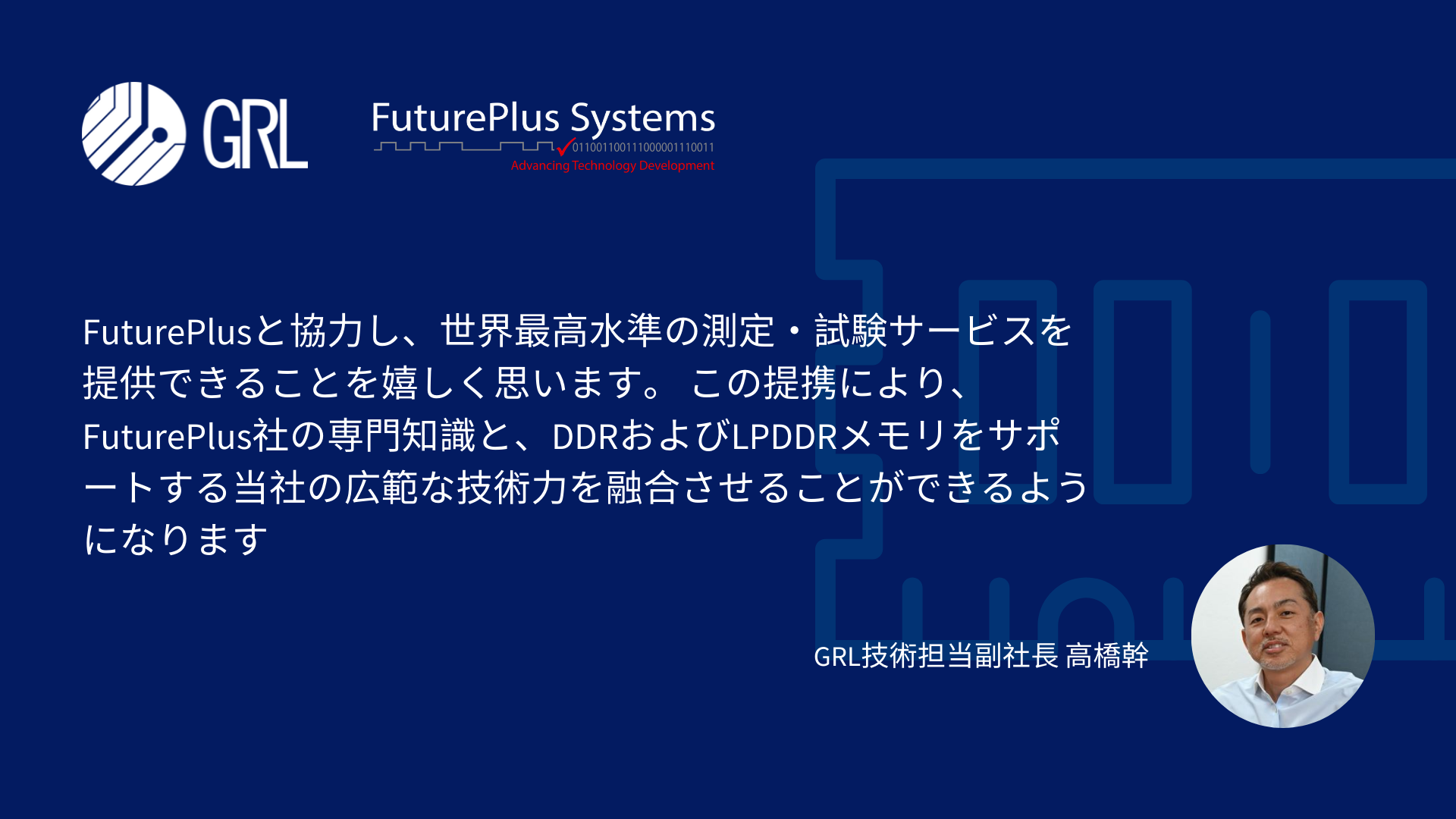 GRL の技術担当副社長である高橋幹は、次のように述べています。 「コンピュータ・メモリはクラウド・コンピューティングの中心であり、組込み機器や自動車、重要インフラ、家電製品などに幅広く使用されています。 FuturePlusと協力し、世界最高水準の測定・試験サービスを提供できることを嬉しく思います。 この提携により、FuturePlus社の専門知識と、DDRおよびLPDDRメモリをサポートする当社の広範な技術力を融合させることができるようになります」