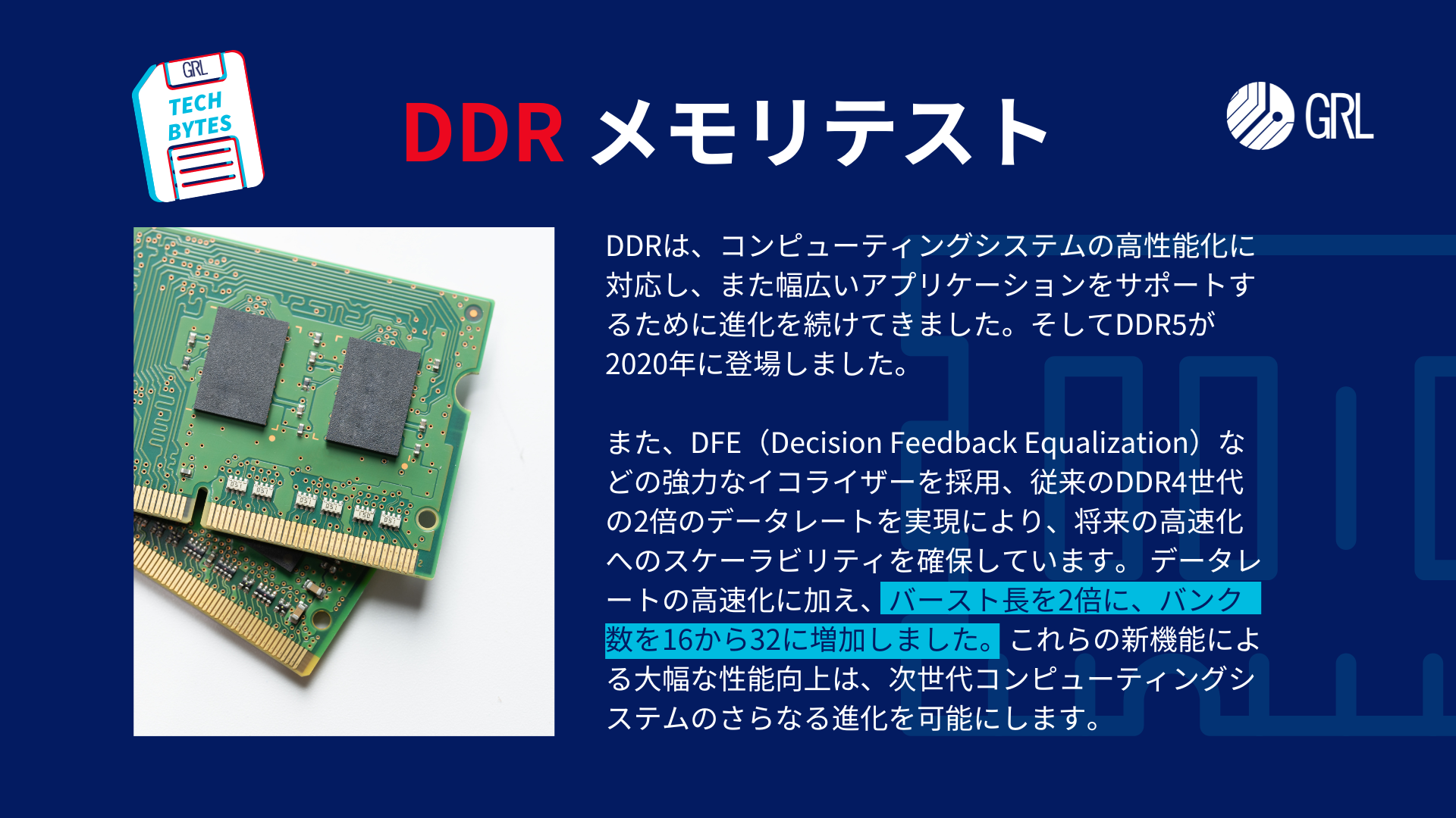 GRLは、FuturePlus社との提携により、世界7カ所のラボで提供しているDDRおよびLPDDRメモリのテストサービス範囲を拡張しました。 GRLのラボで提供される新しいサービスには、メモリチャネル検証、組み込みメモリ(「MemoryDown」)テスト、ロウハンマーテスト、DIMMおよびSO-DIMM故障解析、さらにマージンテスト、コマンドバス利用率、パワーマネージメント、データバス利用率、バンクグループ解析などの高性能アプリケーション向けメモリ解析が含まれます。 これらの新サービスは、これまでのGRLが持つDDRおよびLPDDR信号品質コンプライアンステスト、メモリバスのシグナルインテグリティ検証における能力に加え、幅広い範囲でDDRメモリのテストサービスを提供することになります。