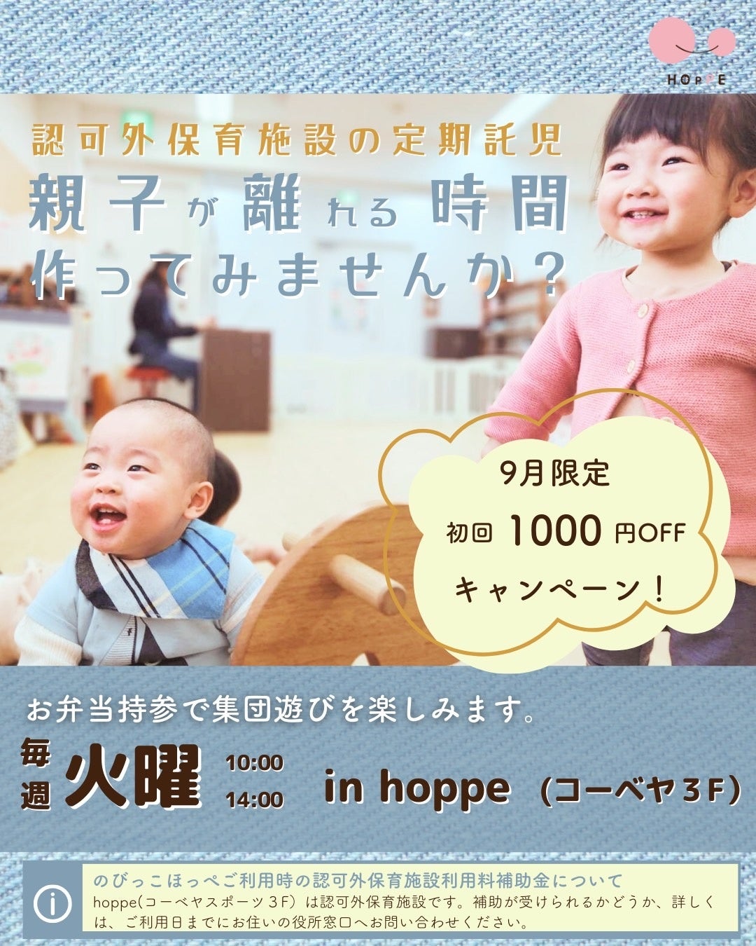 特定非営利活動法人ほっぺ(代表:大森 奈津子)による定期的な託児で母子分離をサポートとする託児サービスとして、毎週火曜日にhoppe(コーベヤスポーツ三木店3階)にて、「のびっこほっぺ」を開催いたします。