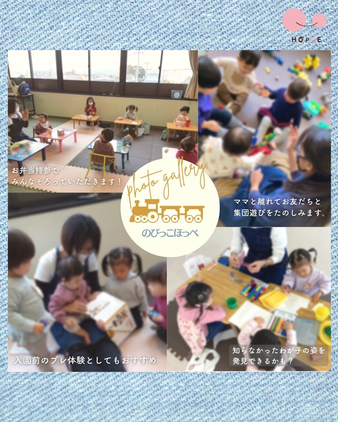 「のびっこほっぺ」は、❝親と離れて、お友だちと過ごす体験!❞をテーマに、お弁当持参で集団遊びを楽しみます。【Webページ】https://hoppe-npo.com/nursery