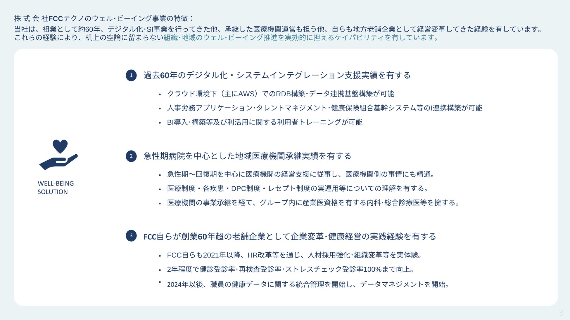 これまで、医療法人の経営支援・30年に渡る健康保険組合向けのコンサルティング及びアウトソーシングを、社内向けて活用するとともに、働き方の柔軟化(フルフレックス・柔軟な雇用形態の導入・業務委託活用等)を推進し、職員の健康意識増進を図ってまいりました。