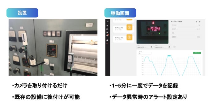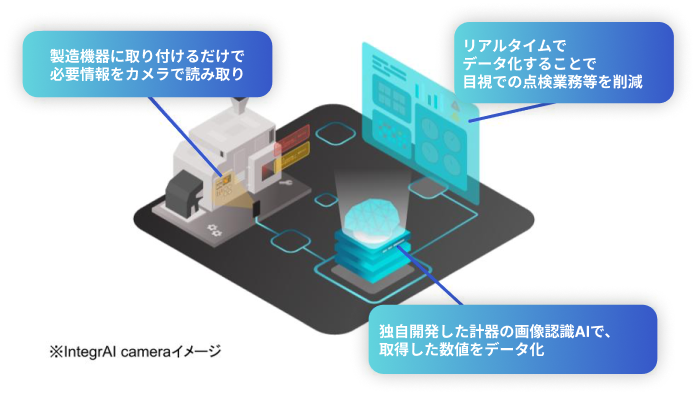 取り付けたカメラとディープラーニングを利用し、アナログメータやデジタルメータ、制御盤などの情報を定期的にデジタルデータ化し、蓄積し遠隔監視するシステム「IntegrAI camera」を提供しています。