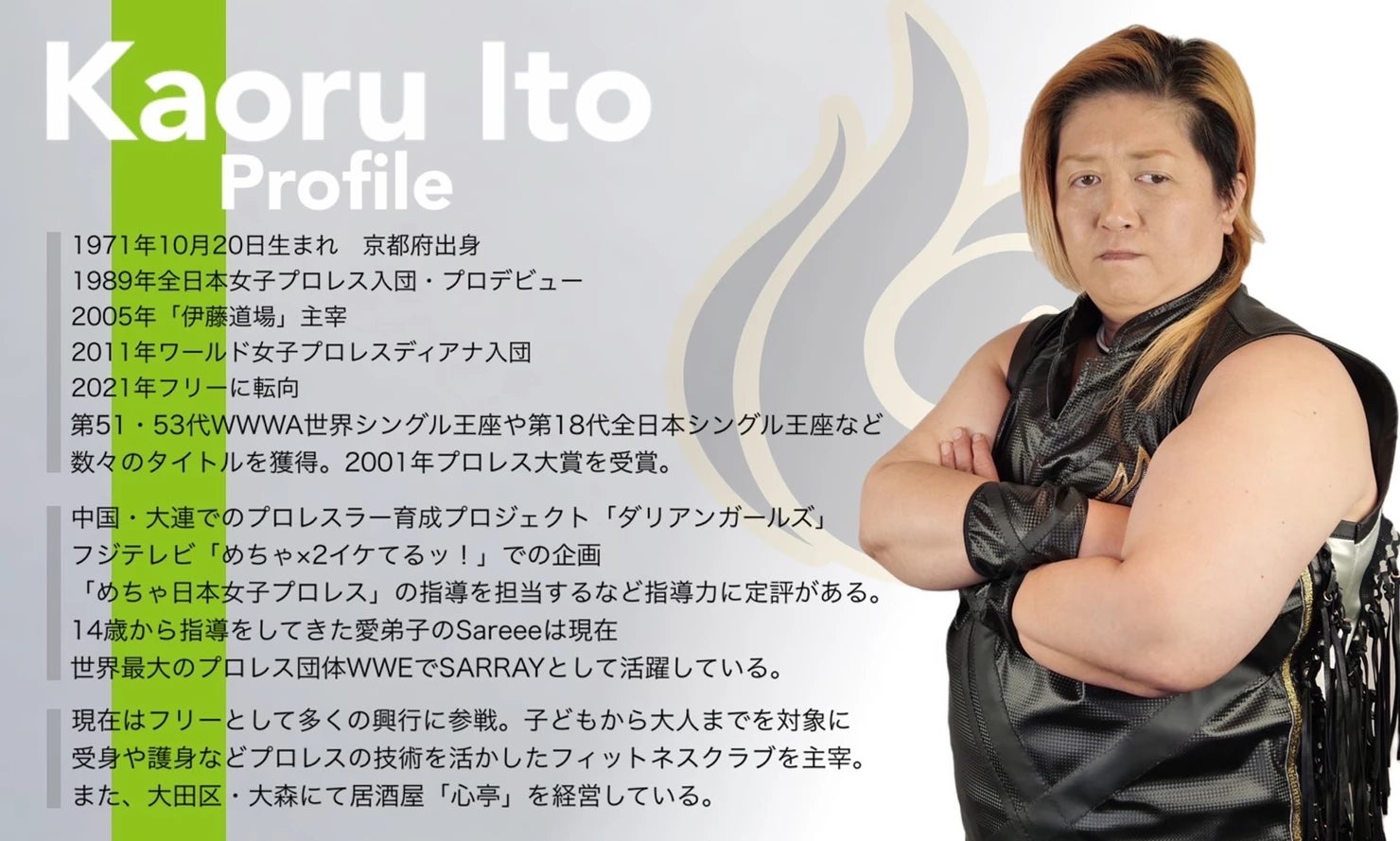 当日は、子どもから大人までを対象に、受け身や護身などプロレスの技術を活かしたフィットネスクラブを主宰しており、ブッタマン選手とプリティ太田選手も指導を受けている、女子プロレスラーの伊藤薫選手をスペシャルゲストにお呼びしております。ご希望の方は、伊藤選手も交え、プロレスリングでの軽い運動を体験いただけます。