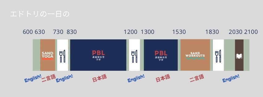子どもたちは・早寝早起き・学びと運動を満遍なく取り入れた生活は、朝6時の起床、ビーチでのヨガではじまります。日中は課題解決型学習(PBL)に挑戦。夕方はビーチでワークアウト。夜の9時には就寝といった規則正しい生活を送ります。