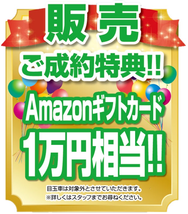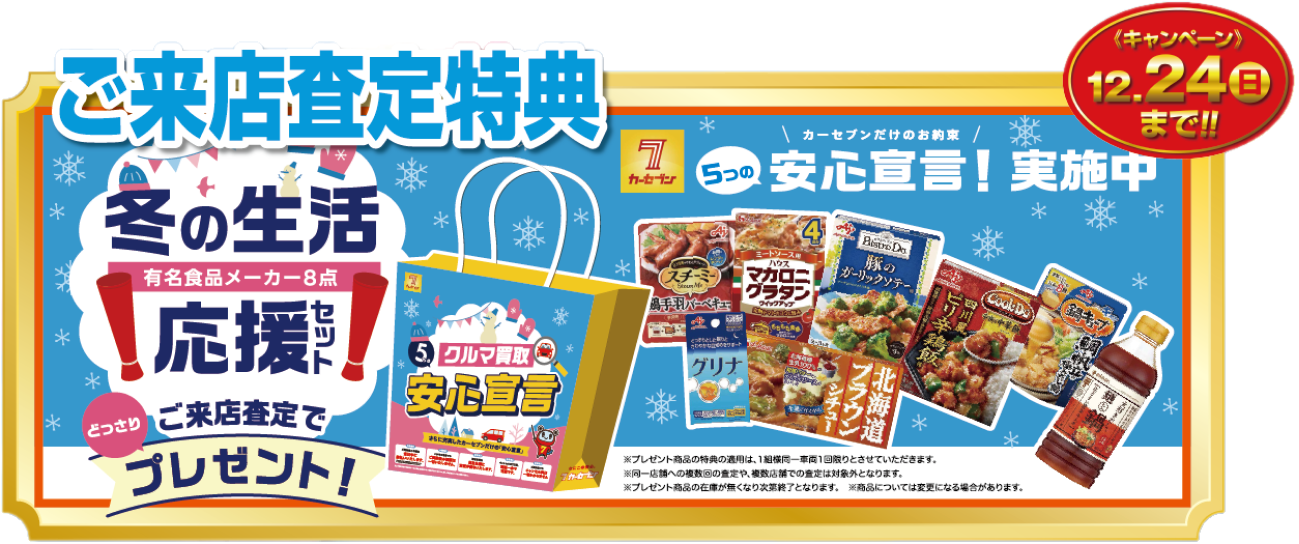 12月24日(日)までオープン記念特別キャンペーンを実施します。買取ご成約特典(買取価格30万円以上)としてカタログギフト5000円相当、販売ご成約でAmazonギフトカード1万円相当をプレゼントいたします。また、ご来店査定のお客様にも有名食品メーカーの商品を詰め合わせた冬の生活応援セット(1組につき車両1回限り、なくなり次第終了します)をご用意しております。国産車から輸入車まで幅広いラインナップを取り揃えております。お得な目玉車両もご用意しておりますので、お気軽にご来店ください。