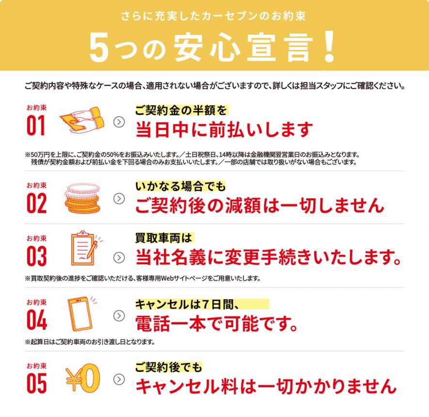 さらに、業界に先駆けて「なにこの安心。」を標語に、お客様から信頼される自動車買取チェーンの実現のため、お客様目線に立った次の5つのお約束をしています。