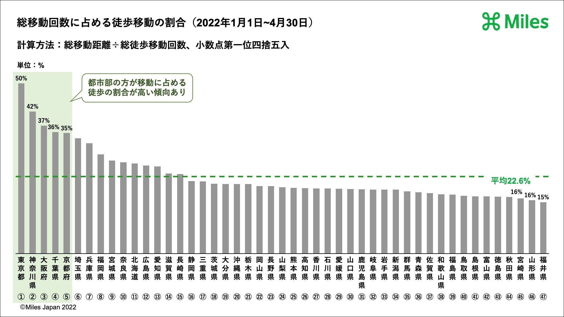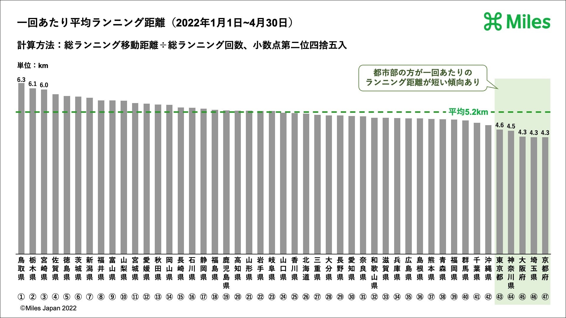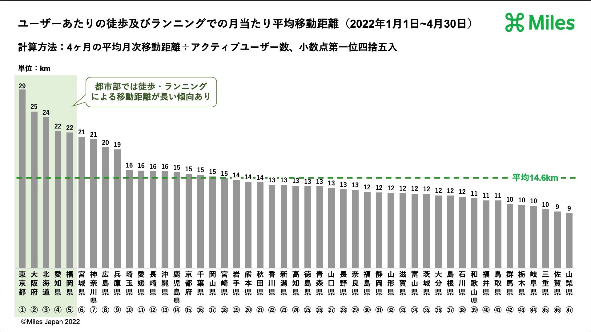 世界中すべての移動でためることができる”米国シリコンバレー発マイレージアプリ”「Miles(マイルズ)」を運営するMiles Japan株式会社(東京都渋谷区、代表取締役CEO:髙橋正巳、以下Miles Japan)は、2022年1月1日〜4月30日までのMilesユーザーの徒歩やランニングに関する移動距離などについての都道府県ランキング(グラフは下部に掲載)などを発表します。