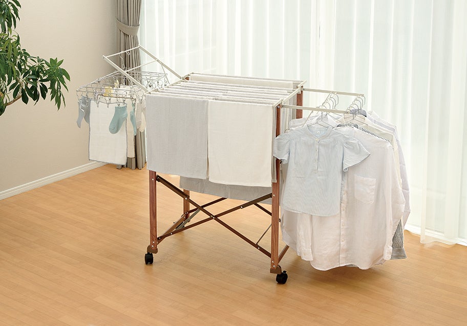 お部屋になじむ家具調デザイン︕軽くてスッキリ収納できる室内物⼲し「ファニチャースタイル 折りたたみ物⼲しスタンド」リッチェルより新発売︕