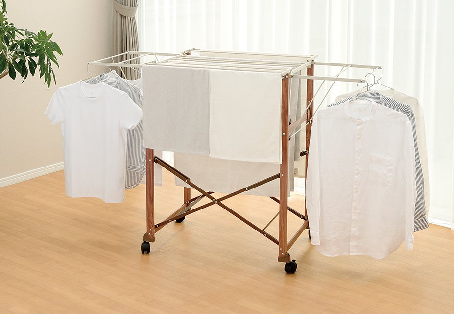 花粉対策や悪天候、共働き世帯の増加などから、洗濯物を室内に干す人が増えています。従来の室内物干しは、インテリアに合わず、リビングや部屋の中で存在感、生活感があるものが多く、急な来客時の片づけに手間取ることもあります。「ファニチャースタイル 折りたたみ物干しスタンド」はお部屋に馴染む⽊目調で、リビングに置いても違和感なく使用でき、不要な際にはサッと折りたたんで、コンパクトに収納することができるインテリア性の高い室内物干しスタンドです。