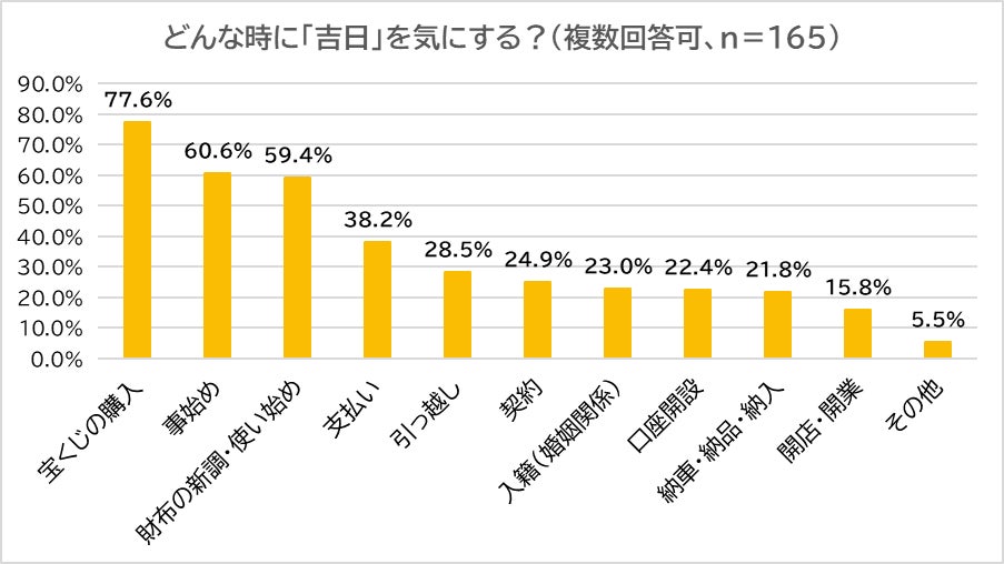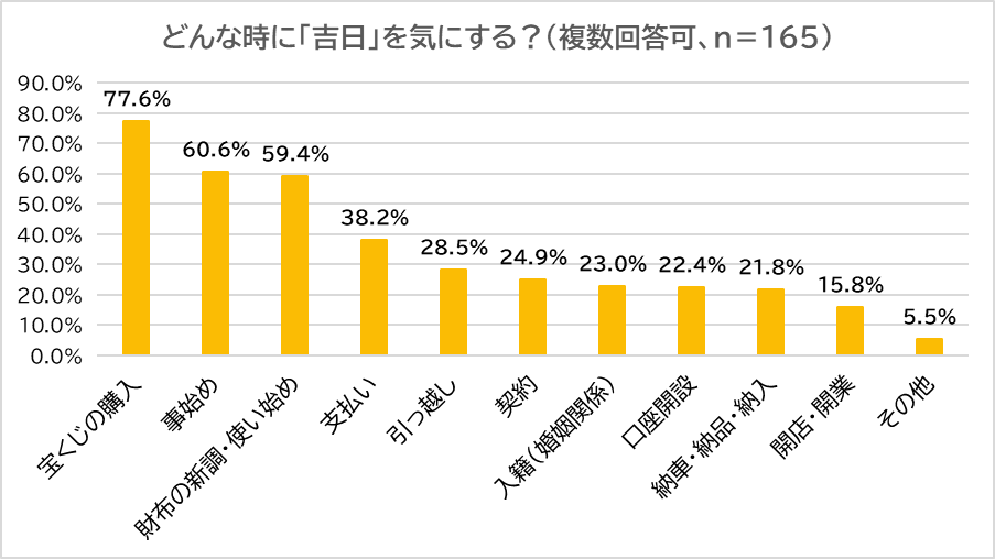 続いて、「どんな時に吉日を気にするか」聞きました。最も多かったのは「宝くじの購入」(77.6%)、以下「事始め」(60.6%)、「財布の新調・使い始め」(59.4%)、「支払い」(38.2%)、「引っ越し」(28.5%)となりました。