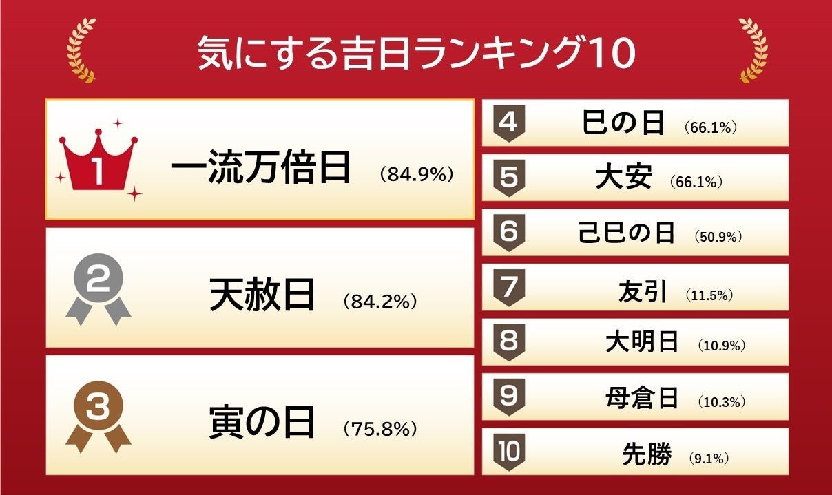 次に、「どの吉日を気にするか」聞きました。1位「一粒万倍日(いちりゅうまんばいび)」(84.9%)、2位「天赦日(てんしゃにち/てんしゃび)」(84.2%)、3位「寅の日(75.8%)、4位「巳の日(みのひ)」(66.1%)、5位「大安」(60.0%)でした。昨今、宝くじ売り場などで「本日は一粒万倍日」と書いてあるポスターやのぼりなどを目にすることも多いためか、「大安」などの六曜よりも「一粒万倍日」などの吉日の方を気にしている人が多いこともわかりました。