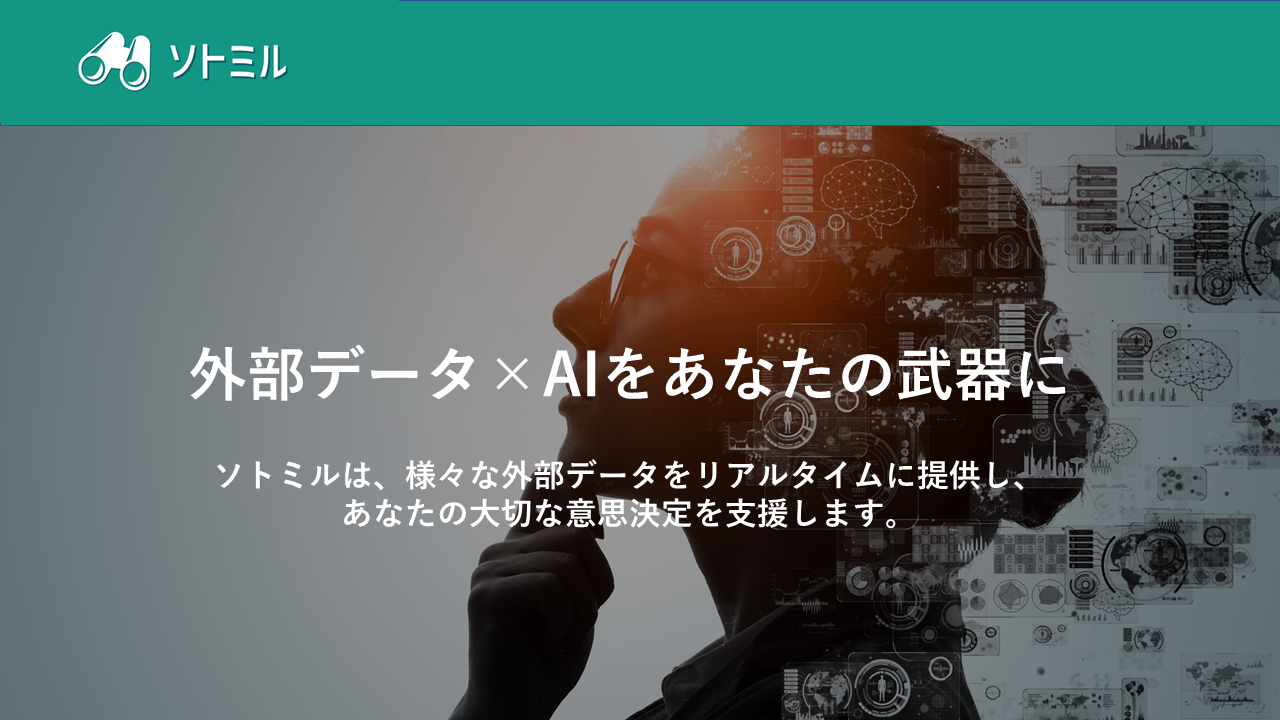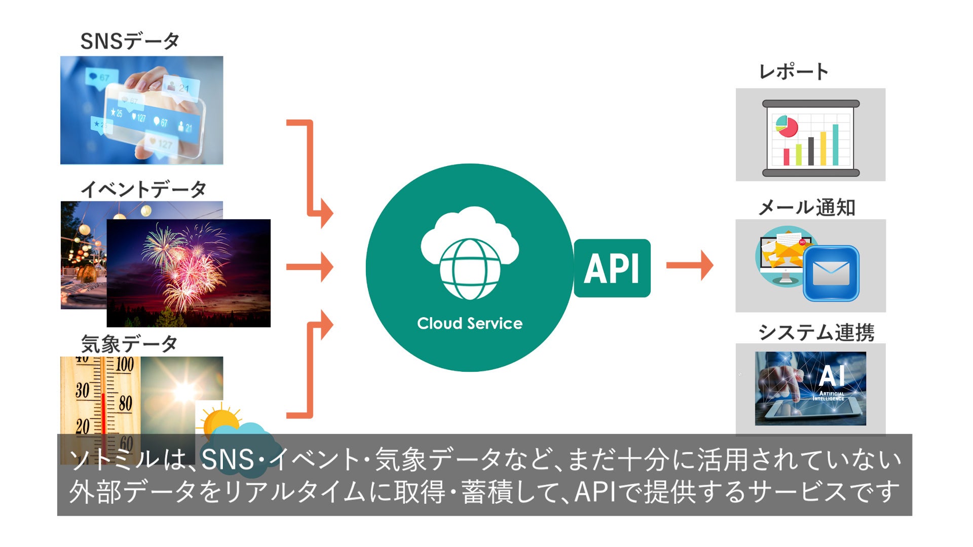 ソトミルは、SNS・イベント・気象データなど、企業においてまだ⼗分に活⽤されていない外部データをリアルタイムに取得・蓄積し、AIによる独⾃の分析処理を加えてAPIで提供するサービスです。