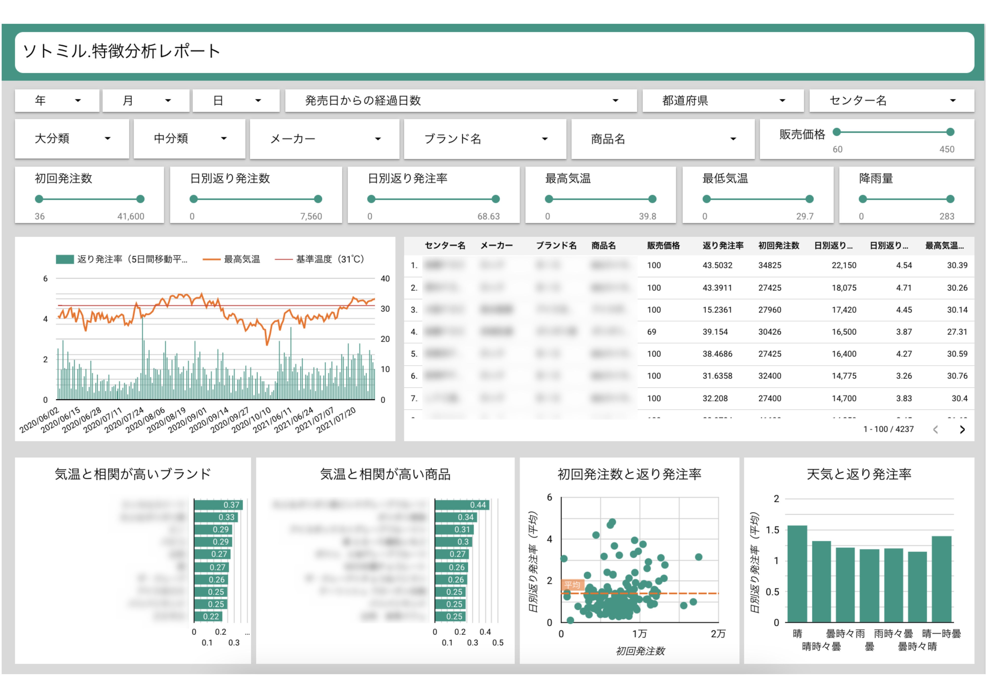 「ソトミル.特徴分析」は商品の販売や出荷情報等をアップロードするだけで外部データとの分析を自動で行い、数千万件以上の組み合わせの中から関連性の高い条件(気象・期間・商品属性)の抽出とダッシュボードに出力することができます。