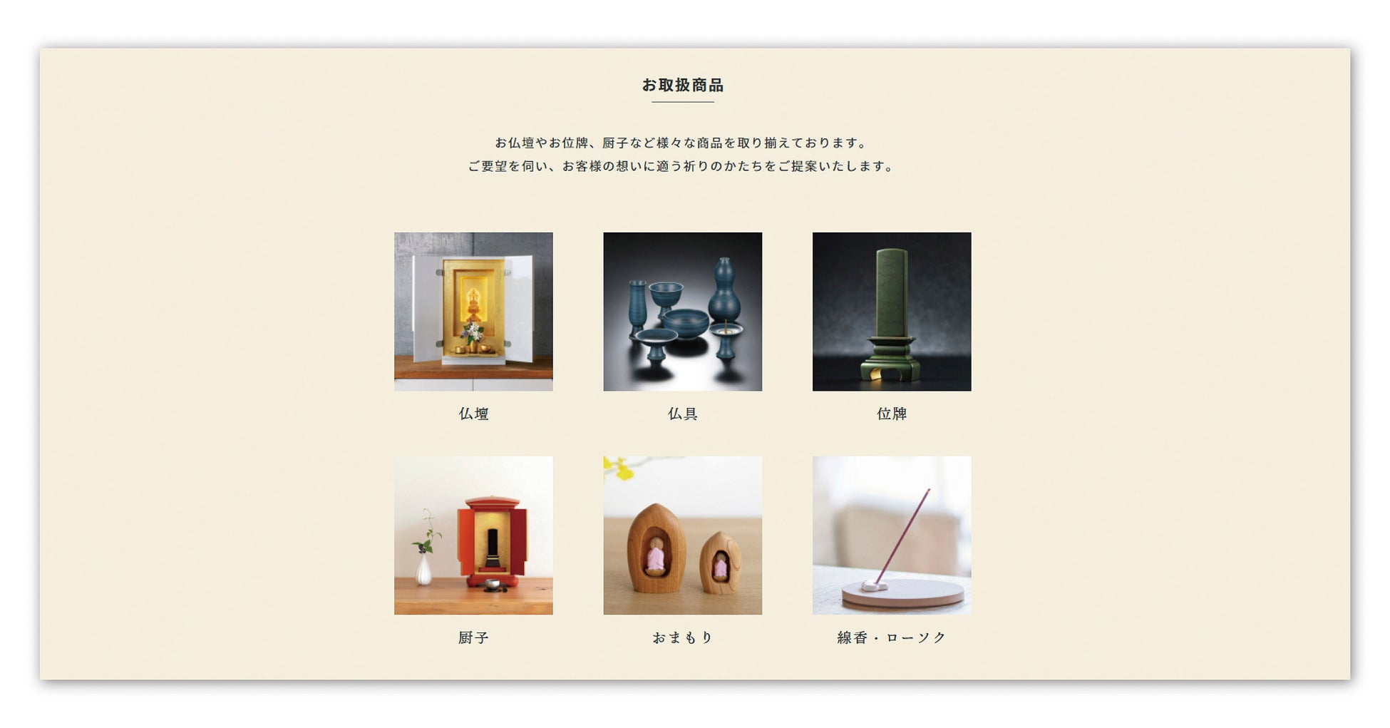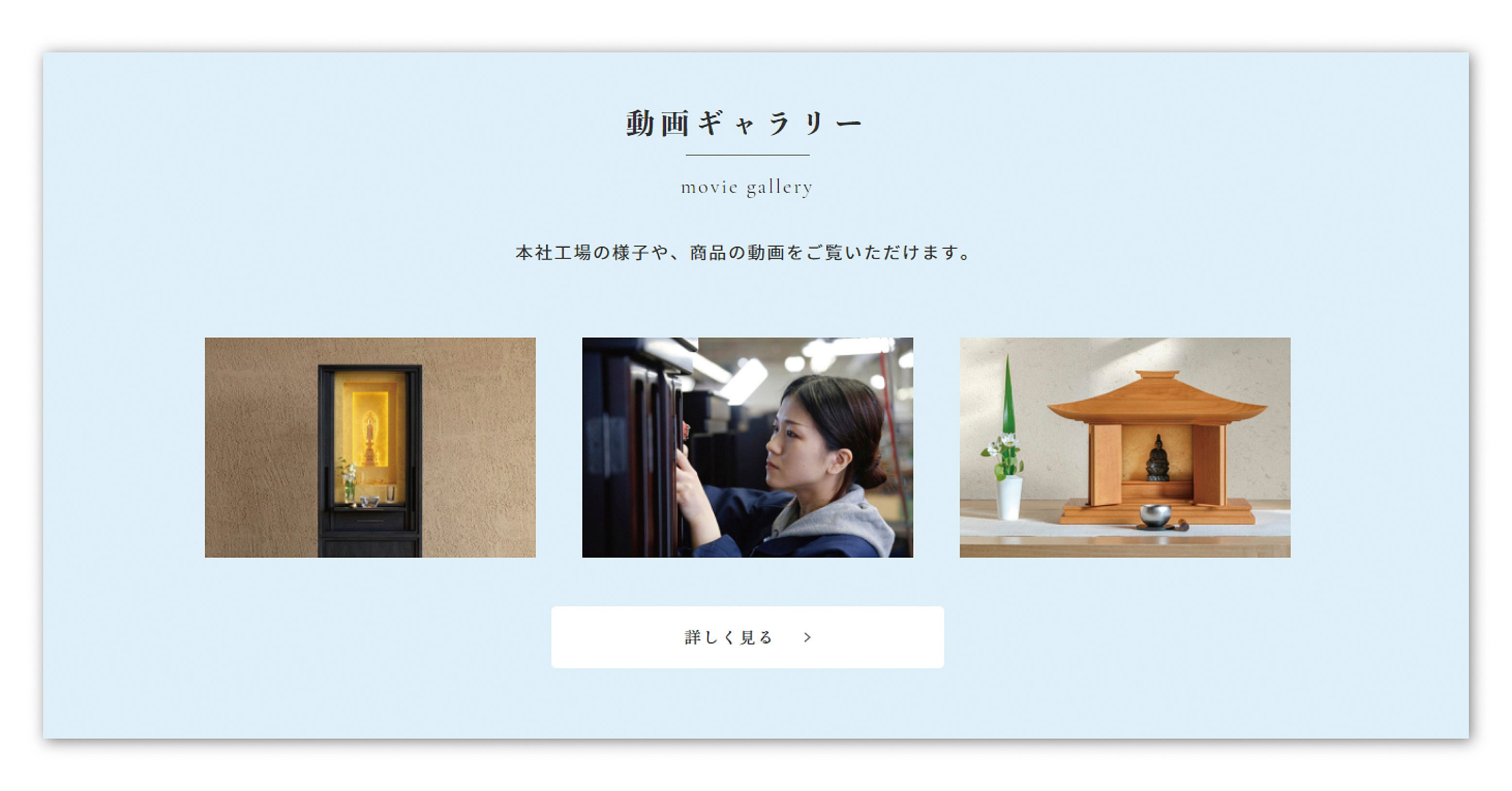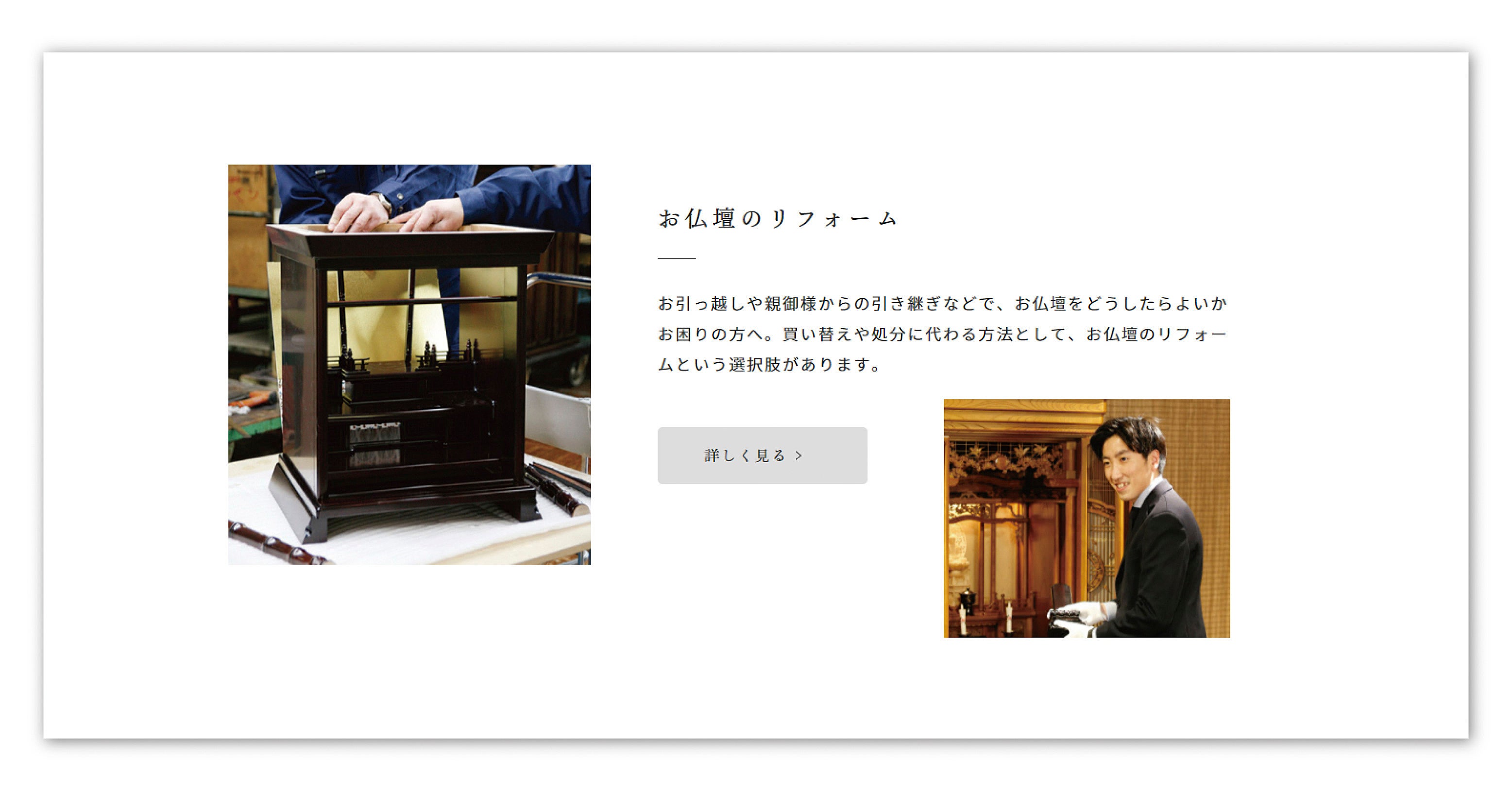 お客様の想いに適う、様々な商品・サービスのご紹介ページを新設いたしました。仏壇・仏具・位牌・厨子など、メーカー直営店ならではの幅広い商品ラインナップや、年々需要が増加している「お仏壇のリフォーム」についてもご紹介しております。併せて動画ギャラリーも設置し、本社工場や商品について、より詳しくご覧いただけるようになりました。