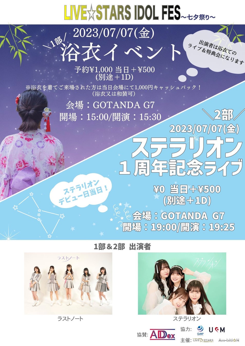 7月7日には、LIVE☆STARSが主催するイベント「LIVE☆STARS IDOL FES~七夕祭り~」が開催予定で、「ラストノート」と「ステラリオン」が、1部:浴衣イベント、2部:ステラリオン1周年記念ライブのそれぞれに出演します。