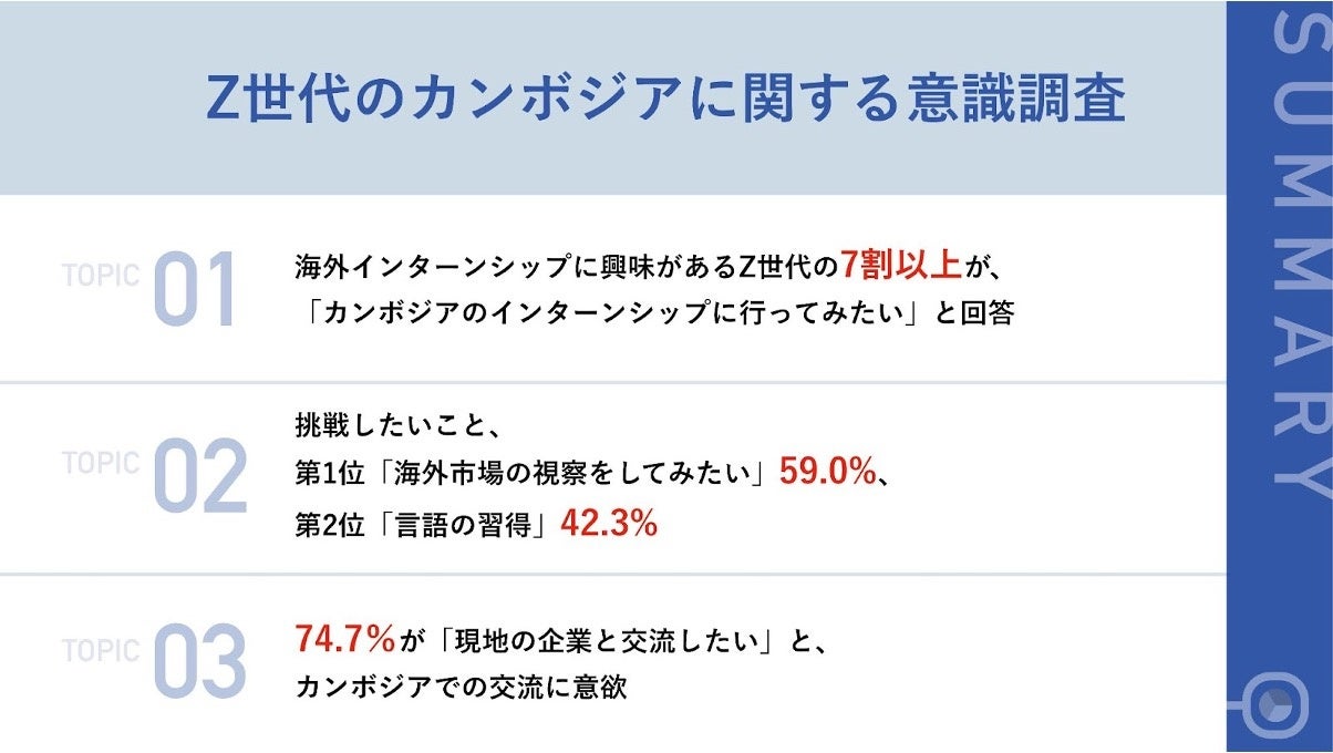 今回の調査では、海外でのインターンシップに興味があるZ世代が、カンボジアに対して多面的な興味を持っており、海外旅行だけではなく、海外インターンシップの目的地としても注目されていることがわかりました。観光地の魅力、現地の人々との交流、ビジネスの可能性など、多くの側面でカンボジアに期待と興味が集まり始めています。観光としてはもちろん、ビジネスチャンスを広げるための旅先として魅力溢れるカンボジアに、一度足を運んでみてはいかがでしょうか。