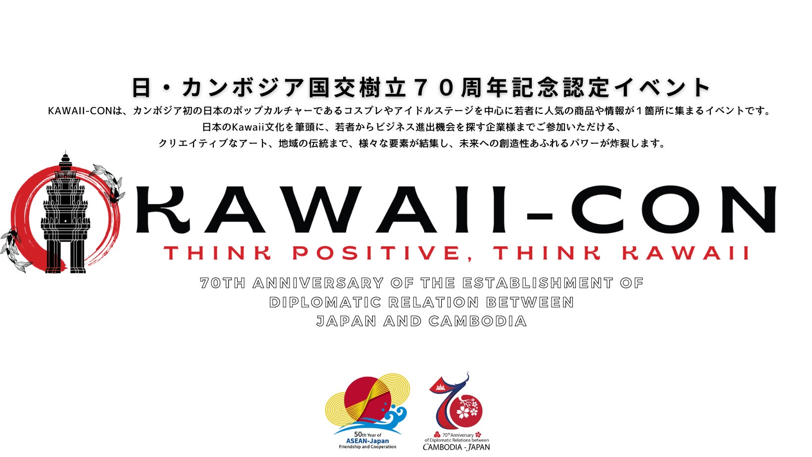 【イベント概要】KAWAII-CONは日本-カンボジア外交樹立70周年記念事業および日本ASEAN友好協力50周年事業として正式に認定されたイベント事業です。JAPANポップカルチャーの角度から盛大にお祝いし、アニメや音楽、着物や生花ショー、コスプレステージ、メイクアップなどの若者パワーの「カワイイ」でアジアを繋ぎ、両国の持続的な発展と経済協力や国交を応援いたします。