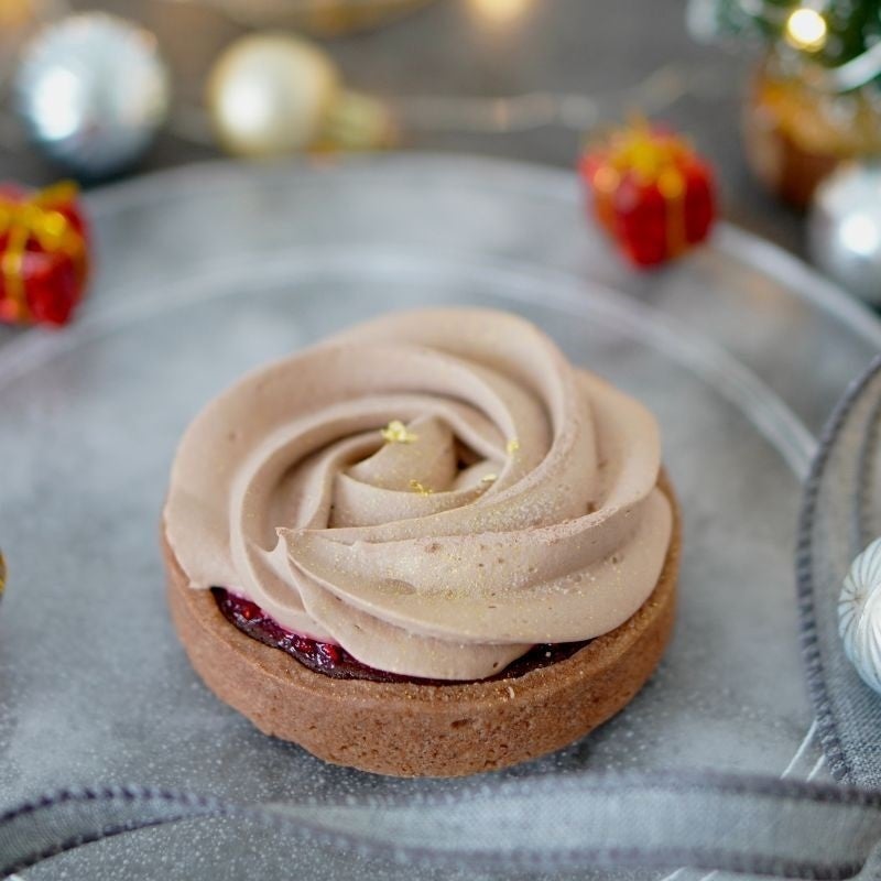 大変希少な国産ラズベリーを使ったチョコタルトケーキで、薔薇モチーフのショコラが華やか。ラズベリーの甘酸っぱさとカカオの香り高いビターなチョコレートの組み合わせは最高です。