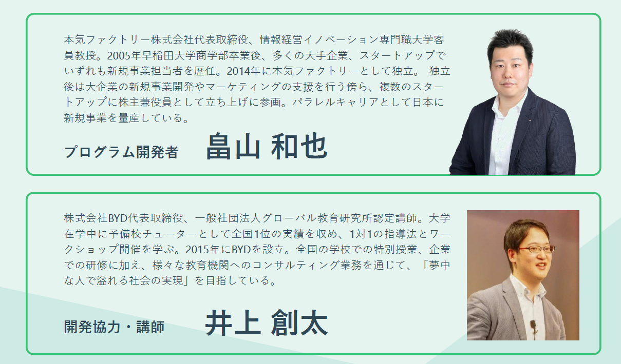 新規事業・スタートアップの専門家と全国の中学・高校で講師を務める教育現場のプロが知見を出し合い、共同開発を行った実践的な教材です。