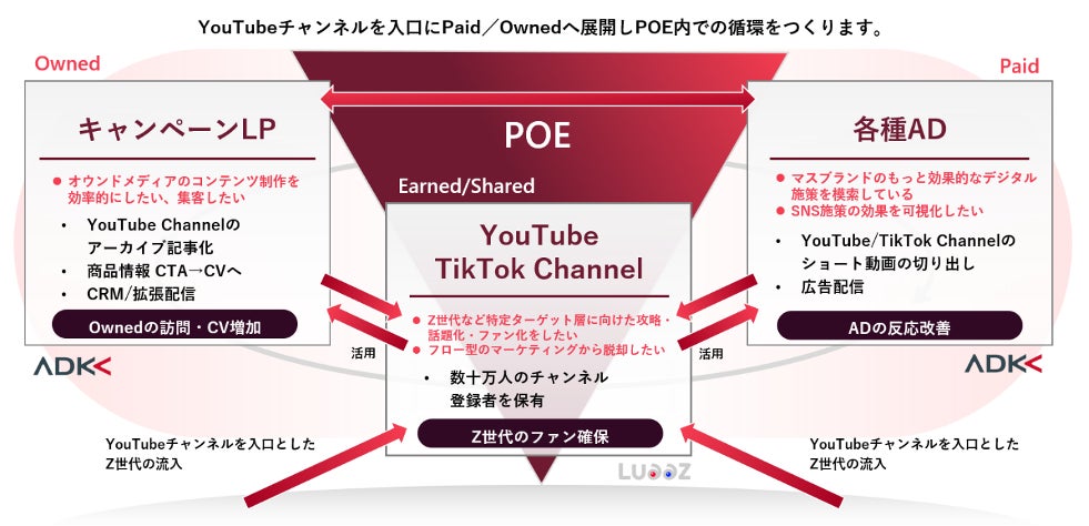 メディアの価値や役割はターゲットやカテゴリによって変化し、POE自体も時代に合わせて変化するため、その都度最適なPOEプランニングを行うことが重要となります。LuaaZが徹底的なZ世代の理解と分析によるコンテンツプロデュースを行い、ADK MSがペイドメディア・オウンドメディアを含めた活用設計やデータ分析を行うことで、クライアントとターゲットとの継続的な接点開発から、ファン育成・LTV向上を実現します。
