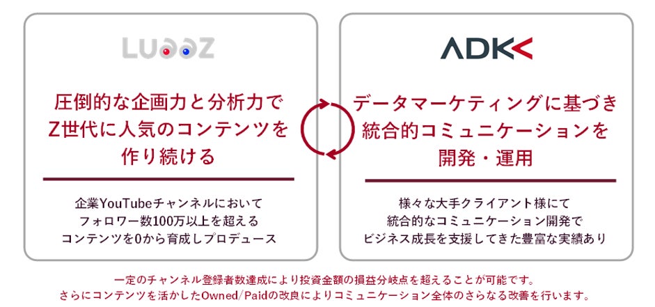 この度、アーンドメディアにおいて「ばんばんざい」や「ひみつ基地。」をはじめ、Z世代に人気のYouTubeチャンネルなどを支援してきたLuaaZと、「新規顧客の獲得」から「顧客の育成」、さらに「ファン起点での新規顧客の獲得」までをフルファネルで対応するADK MSが業務提携し、YouTubeチャンネルを起点とした新たなマーケティングモデルを提供することとなりました。