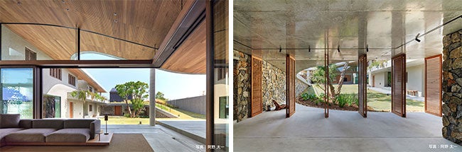 仕上材、ディテール、照明、植栽、アート等、内外部空間をつなげる工夫を随所に散りばめ、屋内と屋外の境界を曖昧にした。空調システムに頼らなくても快適に生活できるように各空間の気候環境を検証し、「外部のように開放的な内部空間」や「内部のように落ち着く外部空間」を作り上げた。